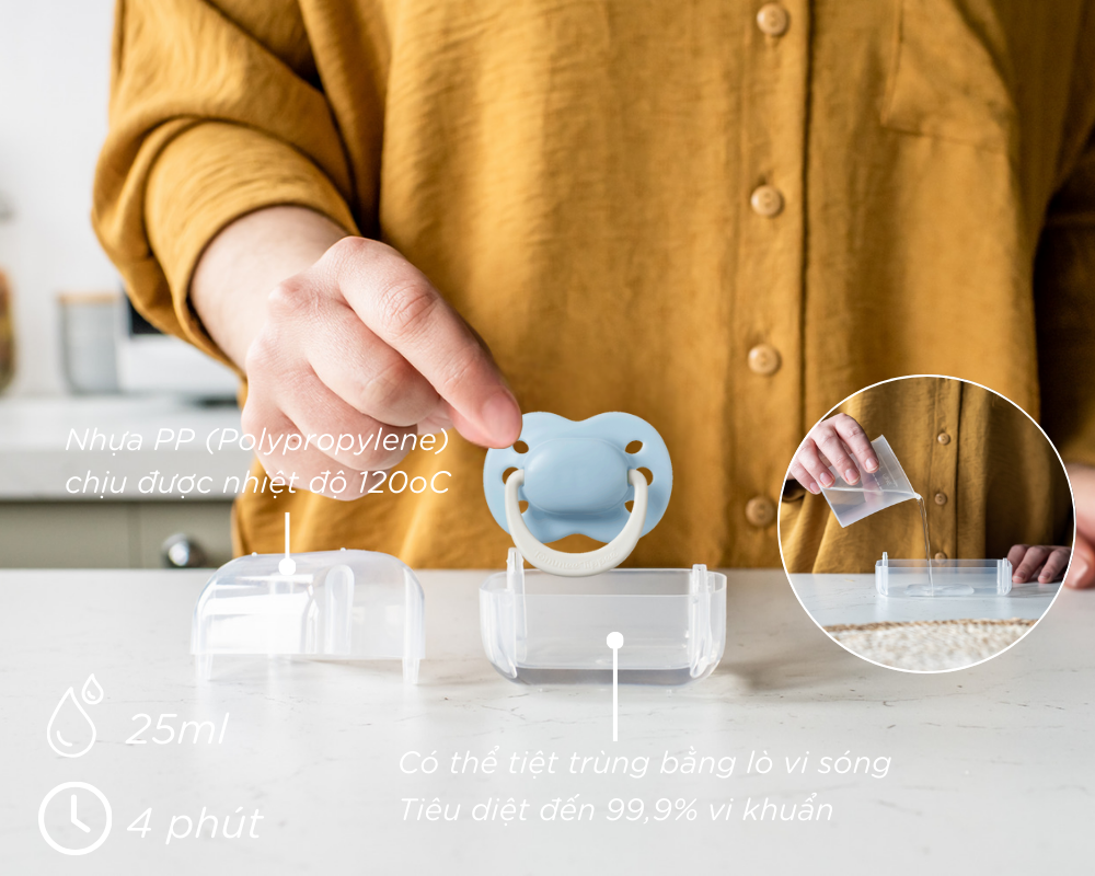 Hộp đựng tiệt trùng có thể tái sử dụng: Bạn có thể cho hộp đựng và ty ngậm vào lò vi sóng với một chút nước để tiệt trùng ty ngậm nhanh chóng và tiêu diệt tới 99,9% vi khuẩn. Ngoài ra, bạn có thể cho ty ngậm vào hộp trong lúc di chuyển ra ngoài để giúp ty ngậm được sạch sẽ và vệ sinh hơn.