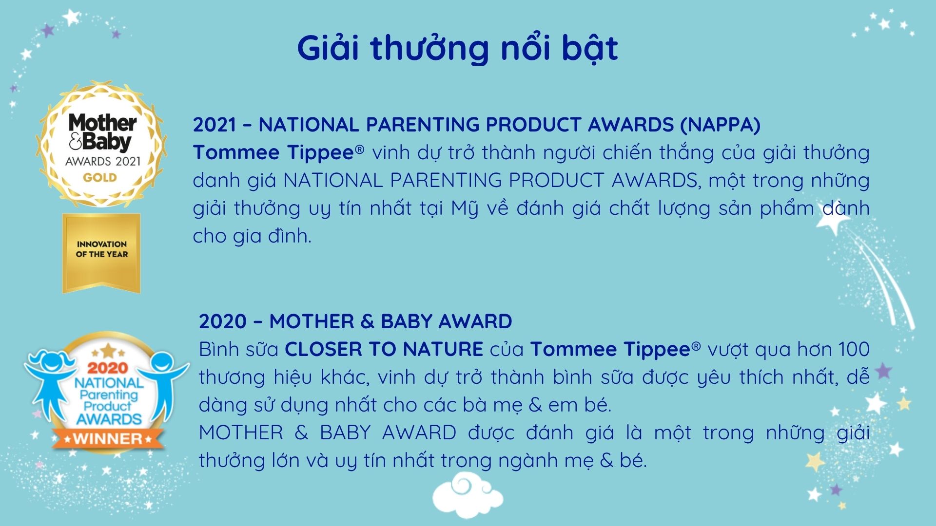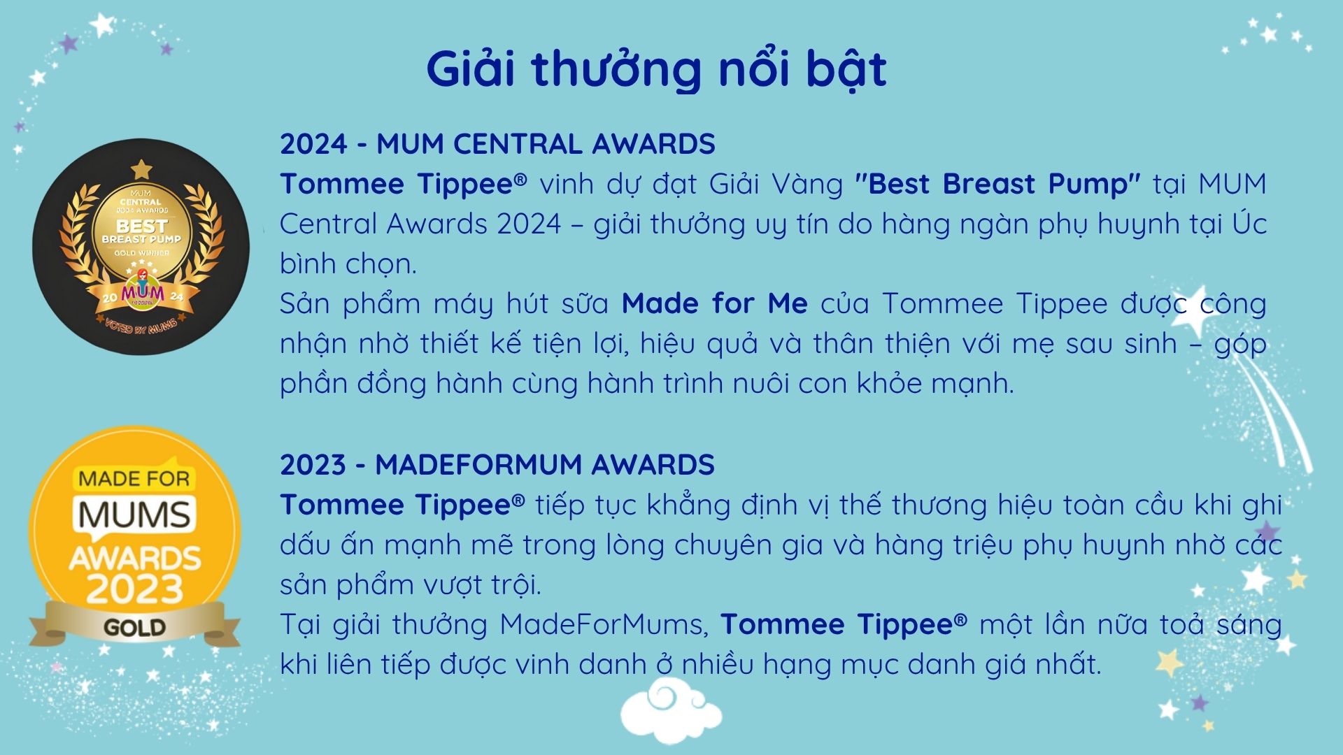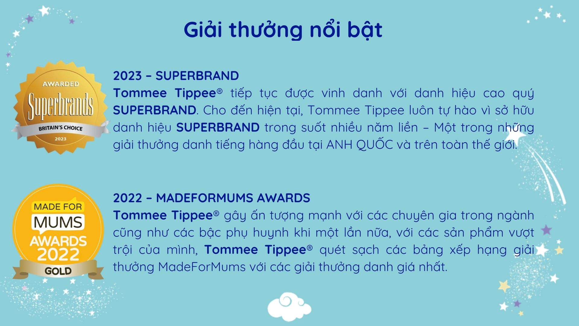 Tommee Tippee mang đến các sản phẩm uy tín, sáng tạo để thúc đẩy sự phát triển ngày càng cao cho bé trong khi vẫn đảm bảo được trải nghiệm đầy hứng thú trong việc chăm sóc bé của các bà mẹ trên toàn thế giới. Tommee Tippee không ngừng sáng tạo, tiên phong để trở thành thương hiệu đồ dùng thiết yếu cho bé được các bà mẹ tin dùng nhất trên toàn cầu. Hãng đã chinh phục được nhiều giải thưởng danh giá trong đó phải kể đến danh hiệu Superbrands tại Anh Quốc trong hơn 10 năm liền.