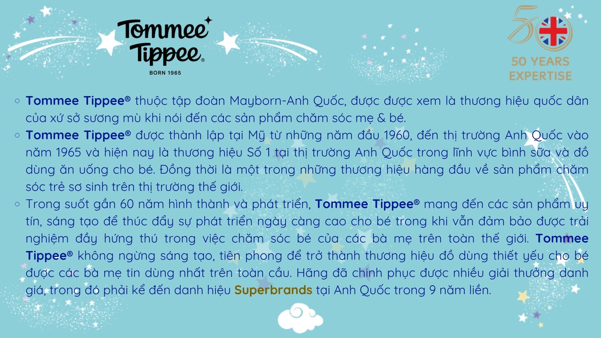 Tommee Tippee thuộc tập đoàn Mayborn, được xem là thương hiệu quốc dân của Anh Quốc, là niềm tự hào của sứ xở sương mù khi nói đến các sản phẩm chăm sóc mẹ và bé.
