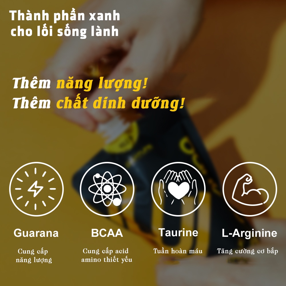 👉Quy cách đóng gói: 10 gói/ hộp 👉Thành phần chính : Thành phần được chọn lựa kĩ lưỡng, an toàn cho sức khỏe như hương chuối nhập khẩu, tinh chất nghệ được xử lí bằng công nghệ Nano giúp cơ thể hấp thụ nhanh, thêm vào đó là chiết xuất bột Guarana, là thành phần chứa caffein tự nhiên, giúp bạn tỉnh táo và tập trung hơn.