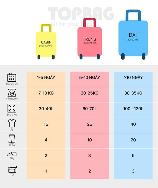 Vì vậy, hãy tính toán cẩn thận trước khi lựa chọn mua một chiếc vali vì tuy thuộc vào mục đích chuyến đi và nhu cầu sử dụng mà chọn nhé. Tuy nhiên thông thường sẽ vẫn theo những tiêu chuẩn cụ thể sau :