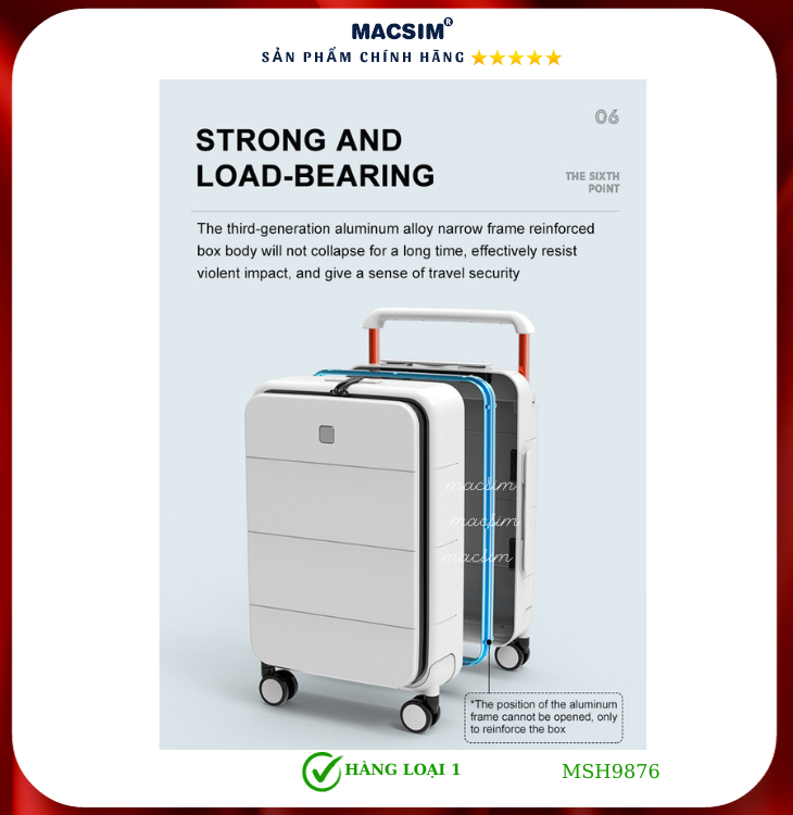 Vali Macsim được làm từ chất liệu nhựa nguyên chất 3 lớp của hãng Bayer xuất xứ Đức. Tấm lót bên trong Poliester 150D xuất xứ Trung Quốc được REACH kiểm nghiệm và phê duyệt, bánh xe 360 độ hãng SJ của Mỹ; Khóa kéo thương hiệu YKK Nhật Bản, Khóa TSA hãng YIE Hồng Công. Tạo nên 1 sản phẩm đẹp, bền, chắc chắn tạo dấu ấn phong cách thời trang cá nhân của bạn trên mọi cuộc hành trình.