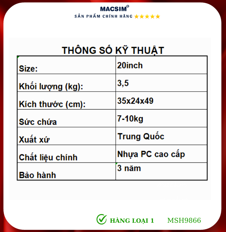 Vali Macsim được làm từ chất liệu nhựa nguyên chất 3 lớp của hãng Bayer xuất xứ Đức. Tấm lót bên trong Poliester 150D xuất xứ Trung Quốc được REACH kiểm nghiệm và phê duyệt, bánh xe 360 độ hãng SJ của Mỹ; Khóa kéo thương hiệu YKK Nhật Bản, Khóa TSA hãng YIE Hồng Công. Tạo nên 1 sản phẩm đẹp, bền, chắc chắn tạo dấu ấn phong cách thời trang cá nhân của bạn trên mọi cuộc hành trình.
