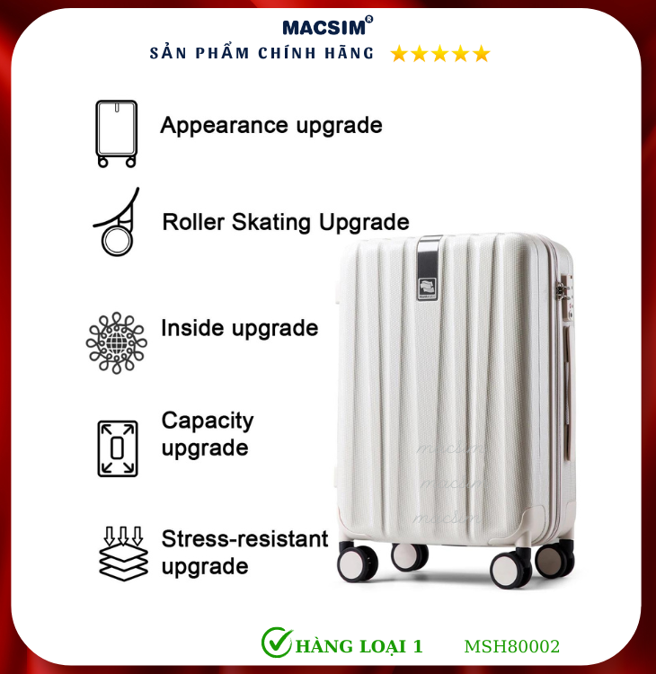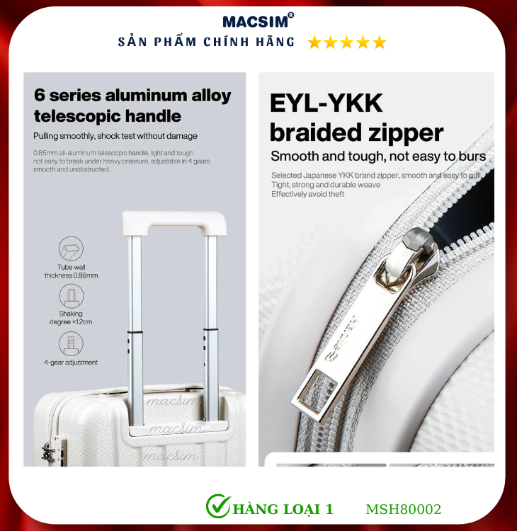 Vali Macsim được làm từ chất liệu nhựa nguyên chất 3 lớp của hãng Bayer xuất xứ Đức. Tấm lót bên trong Poliester 150D xuất xứ Trung Quốc được REACH kiểm nghiệm và phê duyệt, bánh xe 360 độ hãng SJ của Mỹ; Khóa kéo thương hiệu YKK Nhật Bản, Khóa TSA hãng YIE Hồng Công. Tạo nên 1 sản phẩm đẹp, bền, chắc chắn tạo dấu ấn phong cách thời trang cá nhân của bạn trên mọi cuộc hành trình.