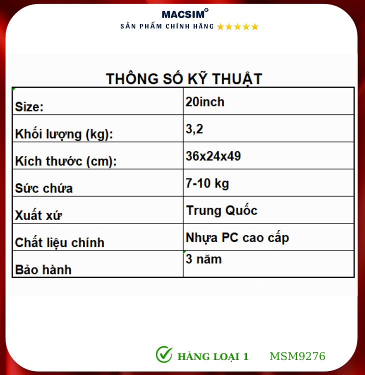 Vali Macsim được làm từ chất liệu nhựa nguyên chất 3 lớp của hãng Bayer xuất xứ Đức. Tấm lót bên trong Poliester 150D xuất xứ Trung Quốc được REACH kiểm nghiệm và phê duyệt, bánh xe 360 độ hãng SJ của Mỹ; Khóa kéo thương hiệu YKK Nhật Bản, Khóa TSA hãng YIE Hồng Công. Tạo nên 1 sản phẩm đẹp, bền, chắc chắn tạo dấu ấn phong cách thời trang cá nhân của bạn trên mọi cuộc hành trình.