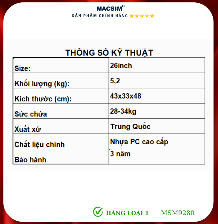 Vali Macsim được làm từ chất liệu nhựa nguyên chất 3 lớp của hãng Bayer xuất xứ Đức. Tấm lót bên trong Poliester 150D xuất xứ Trung Quốc được REACH kiểm nghiệm và phê duyệt, bánh xe 360 độ hãng SJ của Mỹ; Khóa kéo thương hiệu YKK Nhật Bản, Khóa TSA hãng YIE Hồng Công. Tạo nên 1 sản phẩm đẹp, bền, chắc chắn tạo dấu ấn phong cách thời trang cá nhân của bạn trên mọi cuộc hành trình.