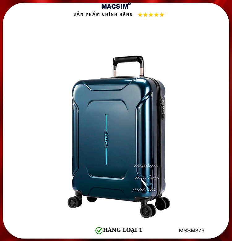 Vali Macsim được làm từ chất liệu nhựa nguyên chất PC. Tấm lót bên trong Poliester 150D xuất xứ Trung Quốc được REACH kiểm nghiệm và phê duyệt, bánh xe 360 độ hãng Hinomoto của Nhật ; Khóa kéo thương hiệu SBS xuất xứ Trung Quốc, Khóa TSA hãng Master Lock của Mỹ. Thiết kế vali đơn giản lịch lãm vô cùng sang trọng, bền bỉ, tạo dấu ấn phong cách thời trang cá nhân của bạn trên mọi cuộc hành trình. Vali cao cấp Macssim thích hợp với những người thường xuyên di chuyển cần chiếc vali nhẹ, có độ bền tốt.