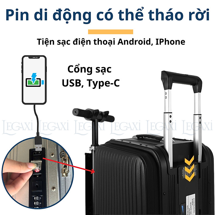 - Trang bị pin lithium tháo rời, có thể sạc điện thoại, laptop, hoặc thiết bị cá nhân trong khi đi du lịch.