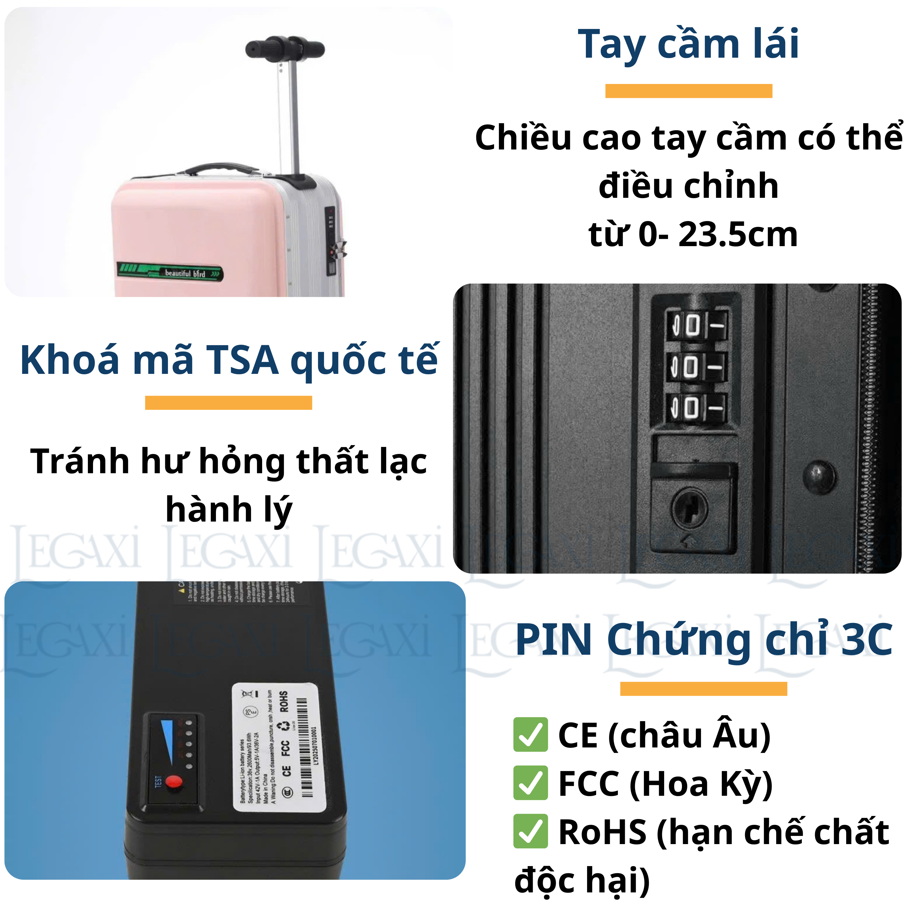 - Thân vali bằng nhôm – ABS siêu bền, chịu tải đến 110kg, bánh xe cao su chống trượt. - Vừa là vali kéo du lịch, vừa là phương tiện di chuyển cá nhân, giúp tiết kiệm thời gian và sức lực.