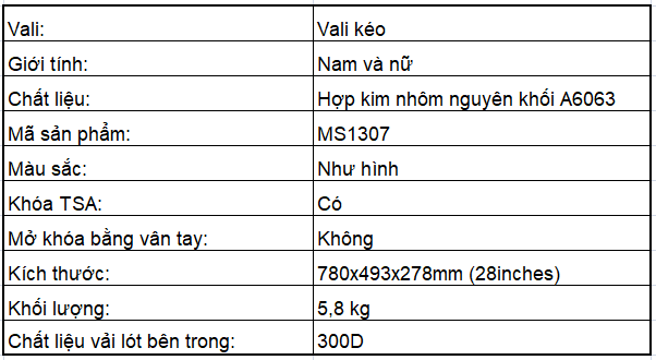 THÔNG TIN SẢN PHẨM VALI NGUYÊN KHỐI HỢP KIM NHÔM A6063