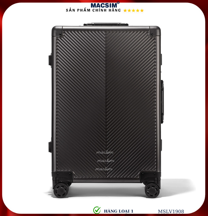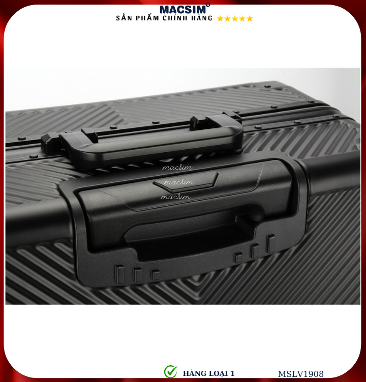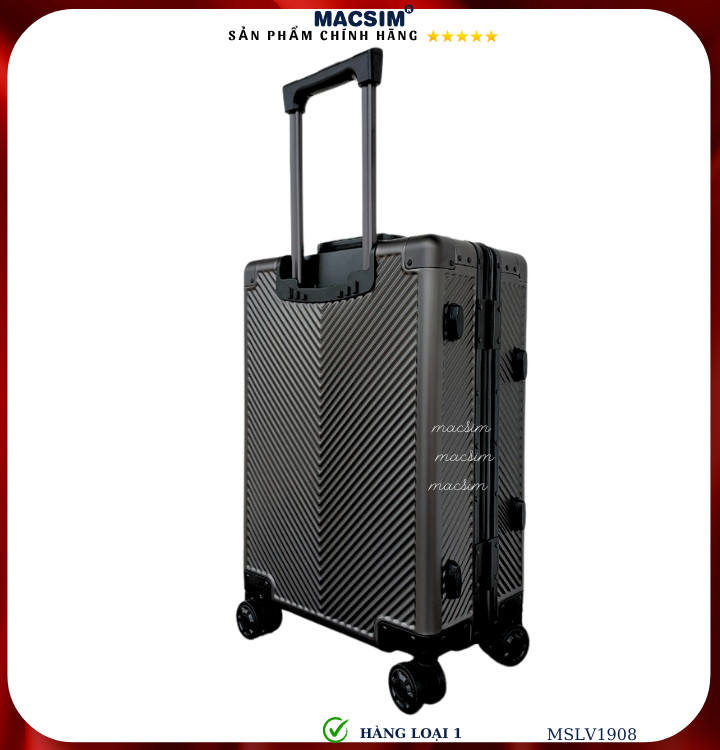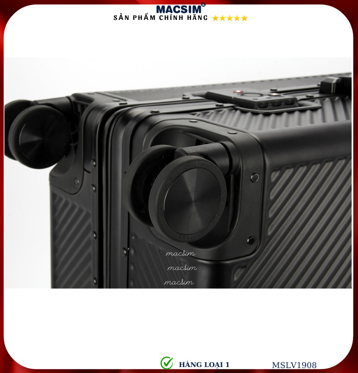 Toàn bộ thân vỏ vali Macsim làm bằng hợp kim nhôm A6063 làm cho vali rất nhẹ, độ đàn hồi cao, chống ăn mòn, chịu được tải trọng lớn.