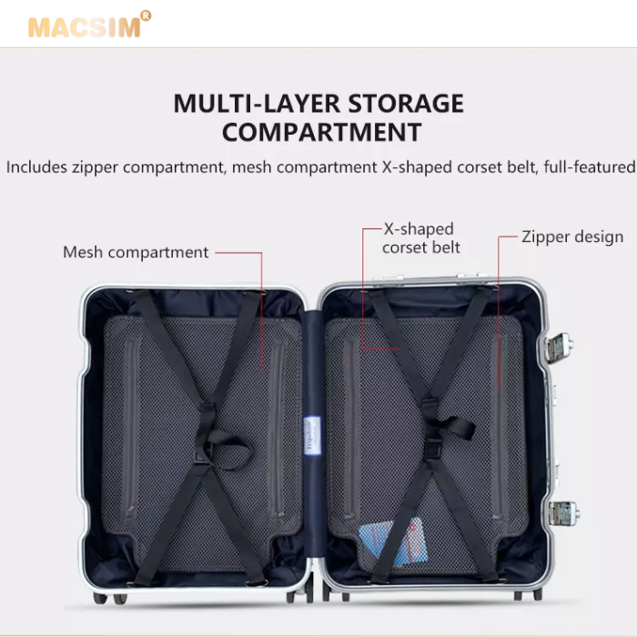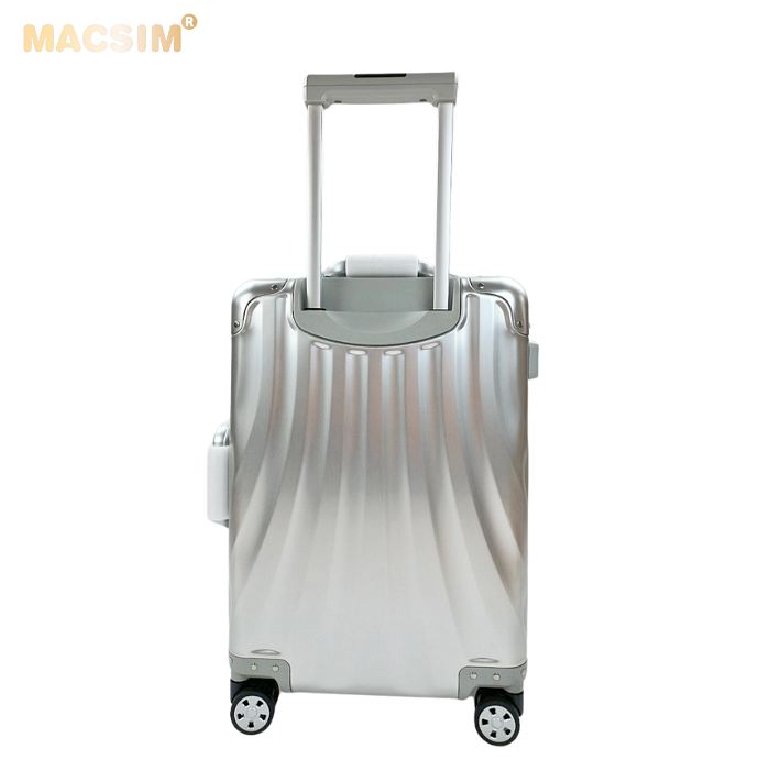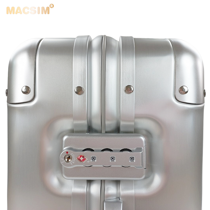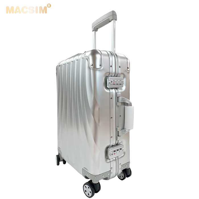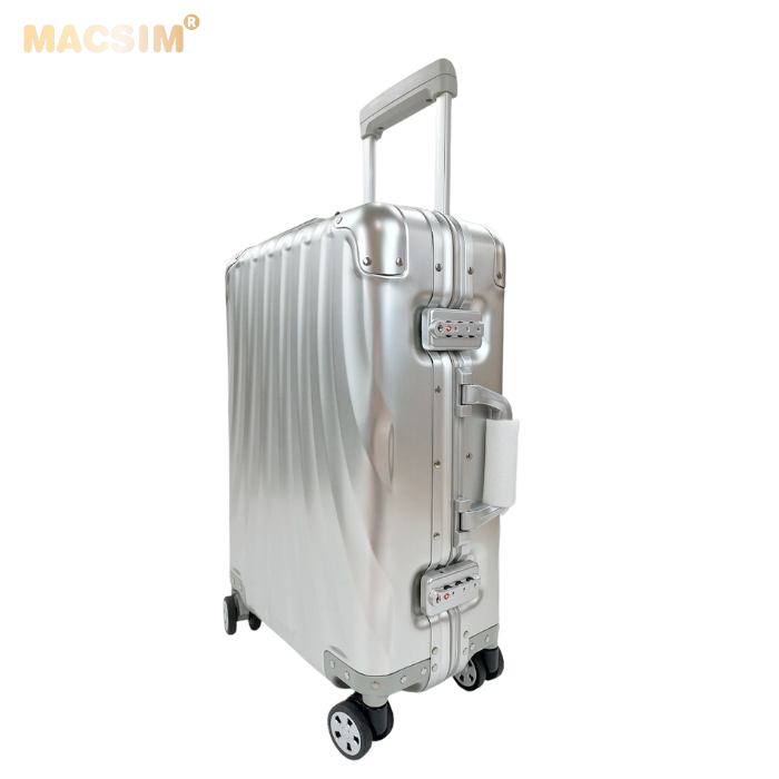 Toàn bộ thân vỏ vali Macsim làm bằng hợp kim nhôm A6063 làm cho vali rất nhẹ, độ đàn hồi cao, chống ăn mòn, chịu được tải trọng lớn.