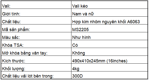 THÔNG TIN SẢN PHẨM VALI NGUYÊN KHỐI HỢP KIM NHÔM A6063