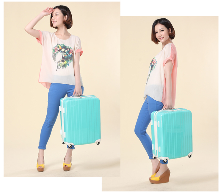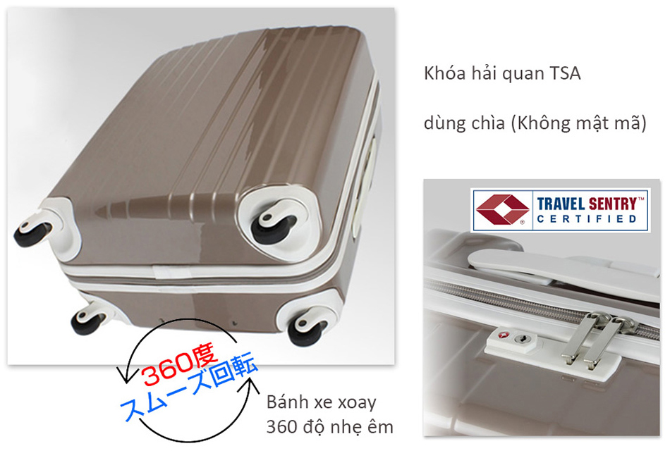 Vali nhựa thời trang nữ 4 bánh xoay có khóa chìa TSA size 20 TT049 có kiểu dáng nữ tính, các chi tiết như bánh xe, tay xách được phối màu trắng sữa thanh lịch. Vali có bốn bánh xe xoay 360 độ nhẹ, chất lượng cao, dùng bền, không bị vỡ như bánh cao su. Quay xách của vali dẻo dai, êm tay, chịu tải tốt, dễ nắm vì được tạo hình khoa học. Cần kéo sử dụng hợp kim nhôm hàng không nhẹ và cứng, điều chỉnh độ cao theo người sử dụng như ý. Nội thất được thiết kế chia đôi 50/50 kín hơi, dễ sắp xếp hành lý mới-cũ phân tách rõ ràng. Nội thất có ngăn lưới phụ, sử dụng dây giữ hành lý chất liệu Nylon chắc chắn không bị yếu và dãn dần như dây thun. Thân vali sử dụng tấm nền ABS, được tráng phủ lớp nhựa ngoài Polycarbonate (Khác loại nhựa pha ABS+PC) sau đó tráng gương phủ ngoài tạo bóng thẩm mỹ (Thân vali 3 lớp).