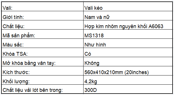 Vali hợp kim nhôm được làm từ nhôm nguyên chất kết hợp với: Silic, đồng, magie...tạo ra sản phẩm có đặc tính vật lý trọng lượng nhẹ, độ cứng, đàn hồi, chống ăn mòn tốt.