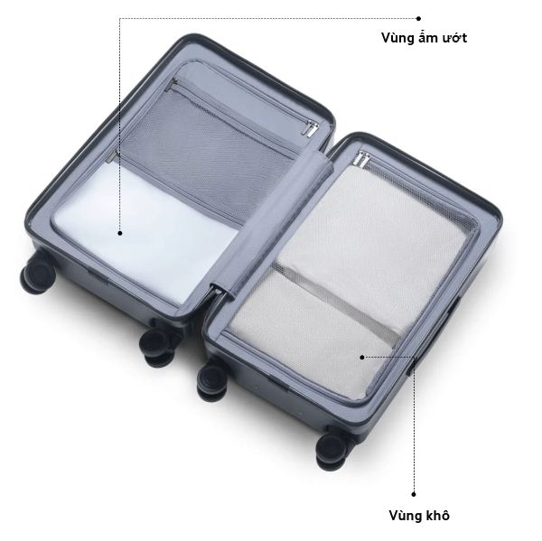 Khóa kéo bên trong hình chữ U kép ngăn không cho đồ vật rơi ra ngoài và giúp lấy đồ vật nhanh chóng và dễ dàng. Ngăn chứa đồ ướt được thiết kế chu đáo giúp đóng gói tiện lợi, không gặp rắc rối.
