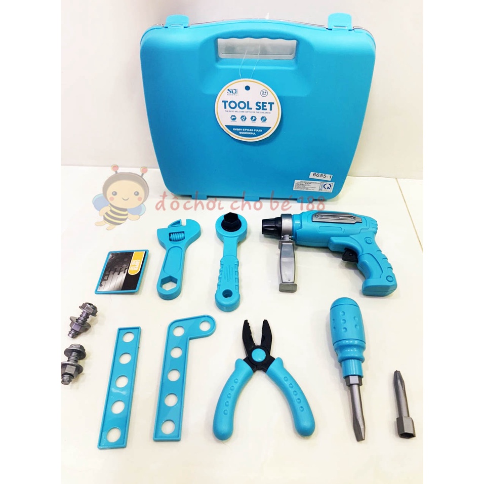 Bao gồm khoan máy,tua vít, kìm, cà lê, bu lông ốc vít.... xếp gọn trong một hộp . đặc biệt máy khoan sử dụng cơ không dùng pin bấm vào sẽ hoạt đông như cưa máy khoan thật nhưng rất an toàn cho bé Bé hãy trở thành một thợ sữa chữa thật chuyên nghiệp, tập tành sửa các món đồ bị hư giúp bố mẹ nhé. Đồ chơi sẽ giúp bé rèn luyện trí nhớ và nhận biết các đồ vật xung quanh, trở nên năng động và cứng cáp hơn. Bộ dụng cụ mô phỏng y hệt các vật dụng thật ngoài đời, với 6 dụng cụ đủ màu sắc tạo được sự thích thú cho bé, gợi cho bé ham mê tìm tòi, khám phá, hiểu biết thêm được nhiều điều về đồ vật xung quanh mình. Rèn luyện sự khéo léo, kích thích phát triển toàn diện Đồ chơi không chỉ mang lại cho bé những giờ phút giải trí vui vẻ mà còn rèn luyện trí nhớ và sự sáng tạo khi bé biết dùng đúng công dụng của từng loại đồ nghề. Bé sẽ được làm quen với các đồ nghề sữa chữa thông dụng, kích thích thị giác phát triển nhờ màu sắc tương phản của các hình khối. Chất liệu an toàn Được làm từ nhựa cao cấp, sơn an toàn cho sức khoẻ của bé (không phai màu, không dính màu, không hại đến da bé), các chi tiết được bo tròn tránh bé bị trầy xước. Cách chơi Hướng dẫn công dụng và dạy bé các sử dụng từng loại đồ nghề. Thích hợp cho trẻ từ 3 tuổi trở lên 6655-1