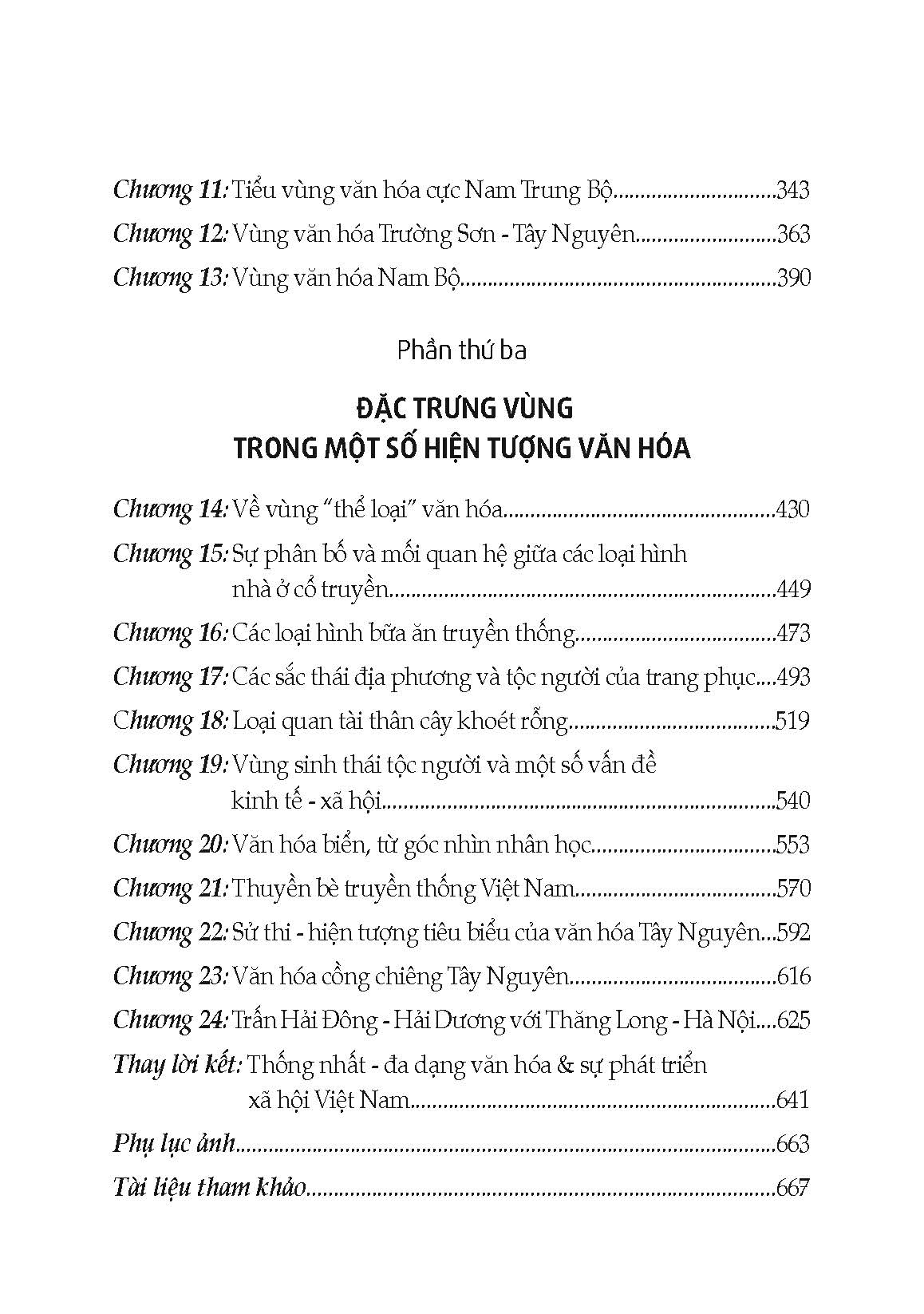 - Phác thảo về phân vùng và một số vùng văn hóa ở Việt Nam - việc phân chia Việt Nam thành 7 vùng văn hóa lớn - Đồng bằng và trung du Bắc Bộ, tiểu vùng văn hóa Xứ Lạng, vùng văn hóa Tây Bắc và miền núi Thanh Nghệ, tiểu vùng văn hóa Xứ Thanh, Xứ Nghệ, Xứ Huế, Xứ Quảng, vùng cực nam Trung Bộ, vùng văn hóa Tây Nguyên - Trường Sơn và vùng văn hóa Nam Bộ.