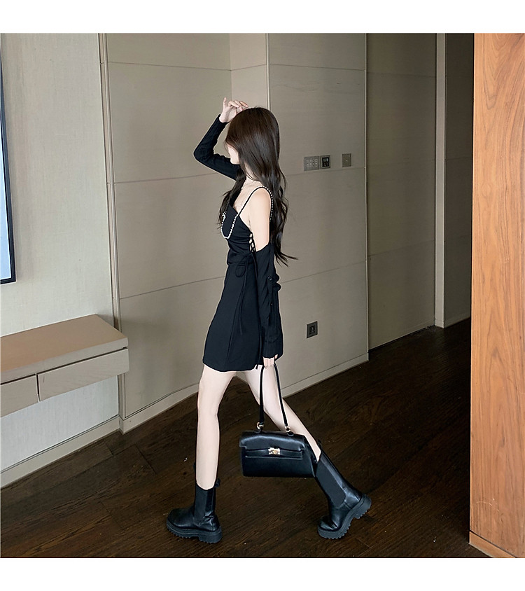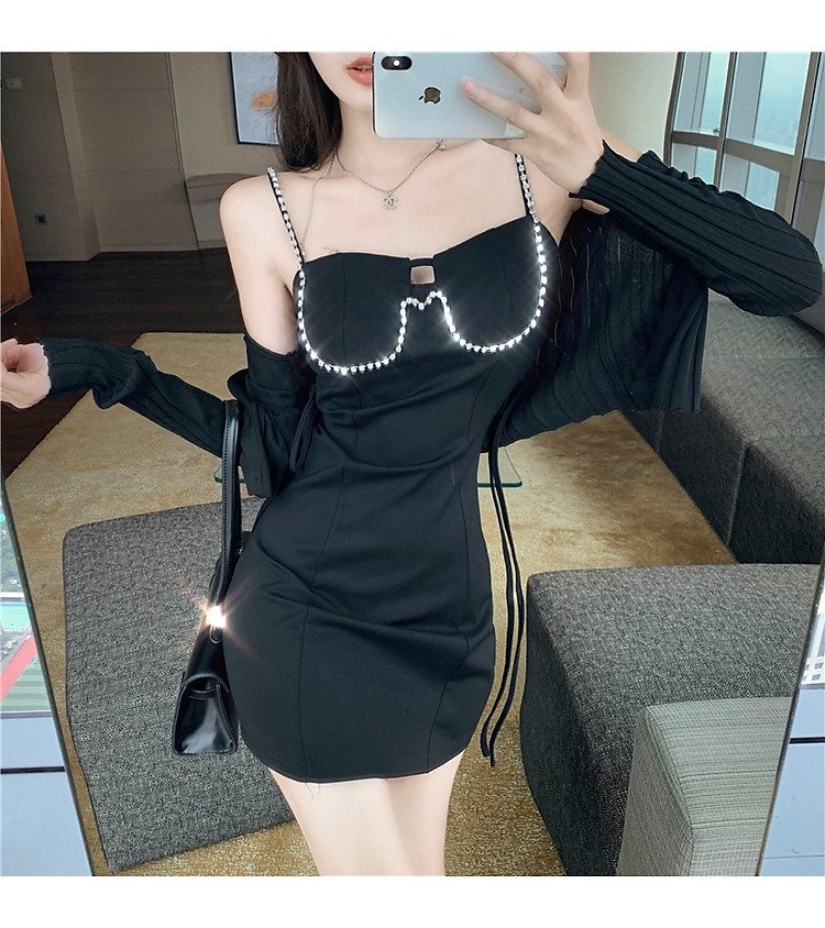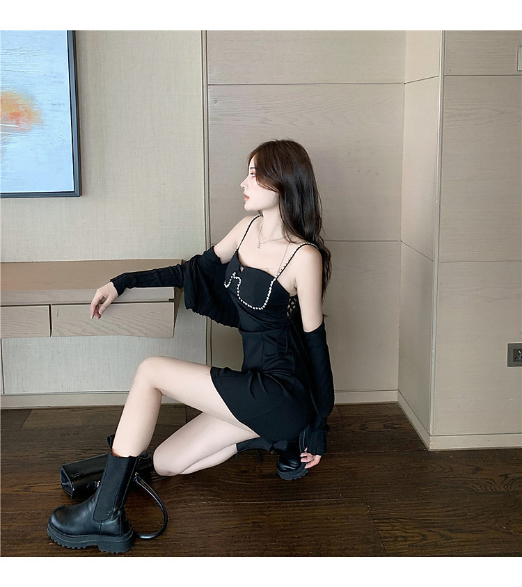 Mẫu đầm với thiết kế 2 dây, phần ngực đính đá lấp lánh được đính thêm cúc sang chảnh.