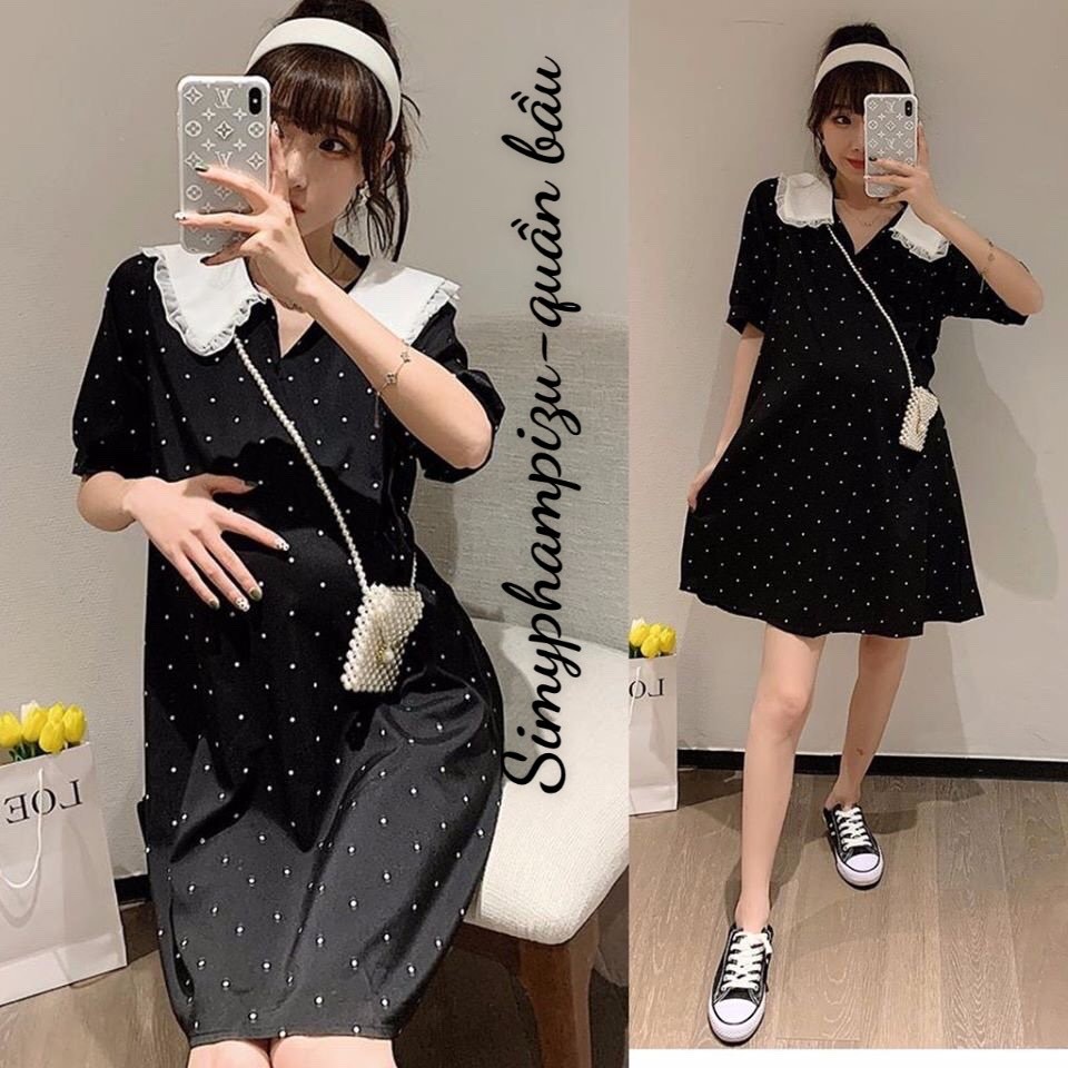Thời Trang Nữ > Đồ Bầu > Đầm bầu || Váy Bầu chấm bi phối cổ bèo trắng V51