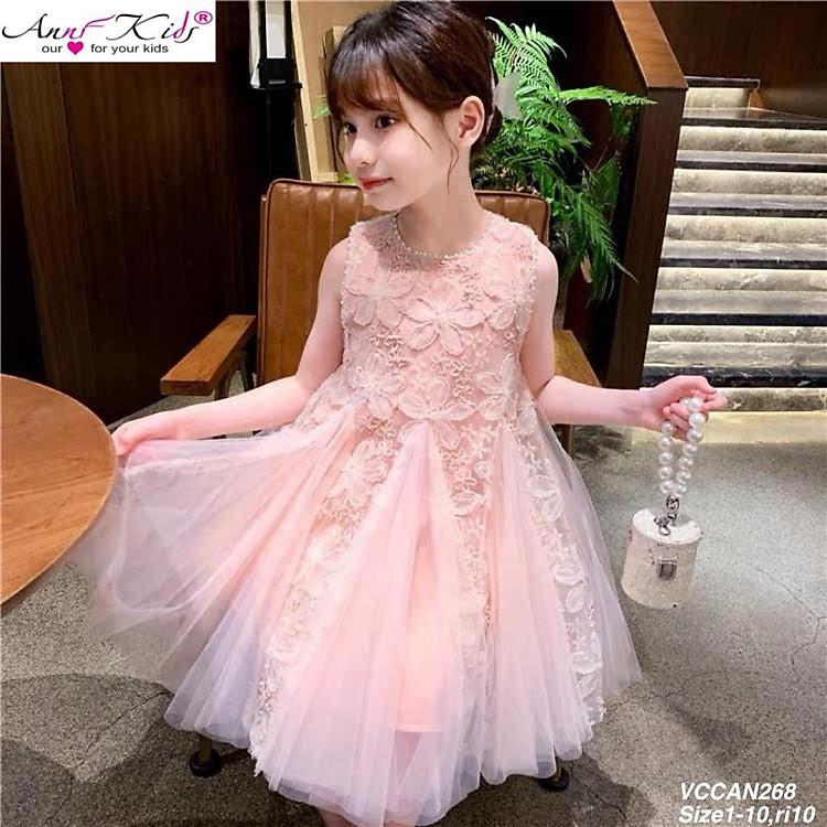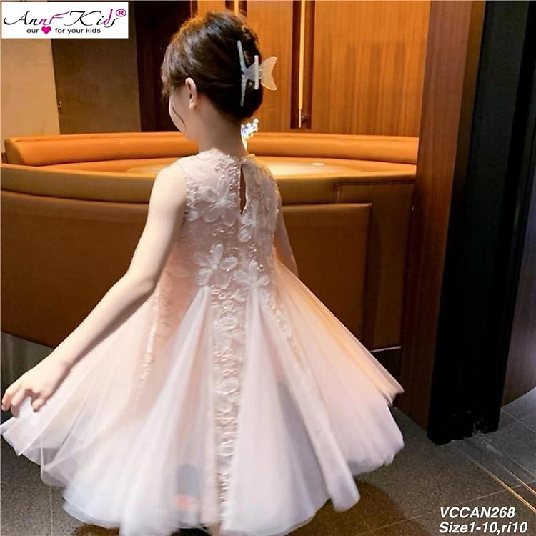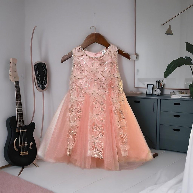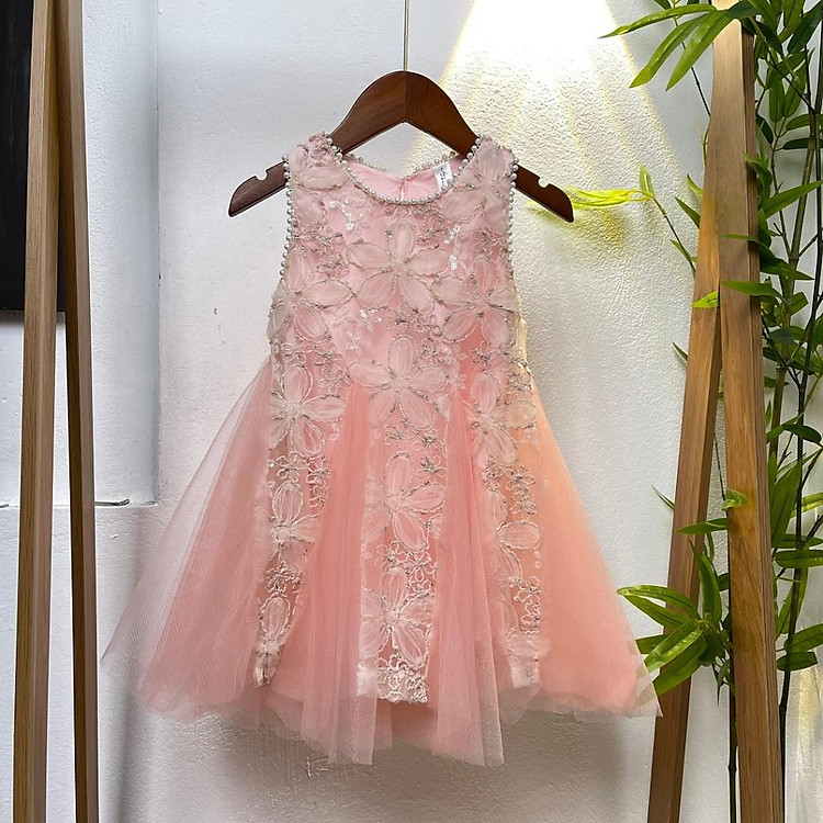 Váy công chúa bé gái sát nách 1-10 tuổi đính hoa nổi và kim sa