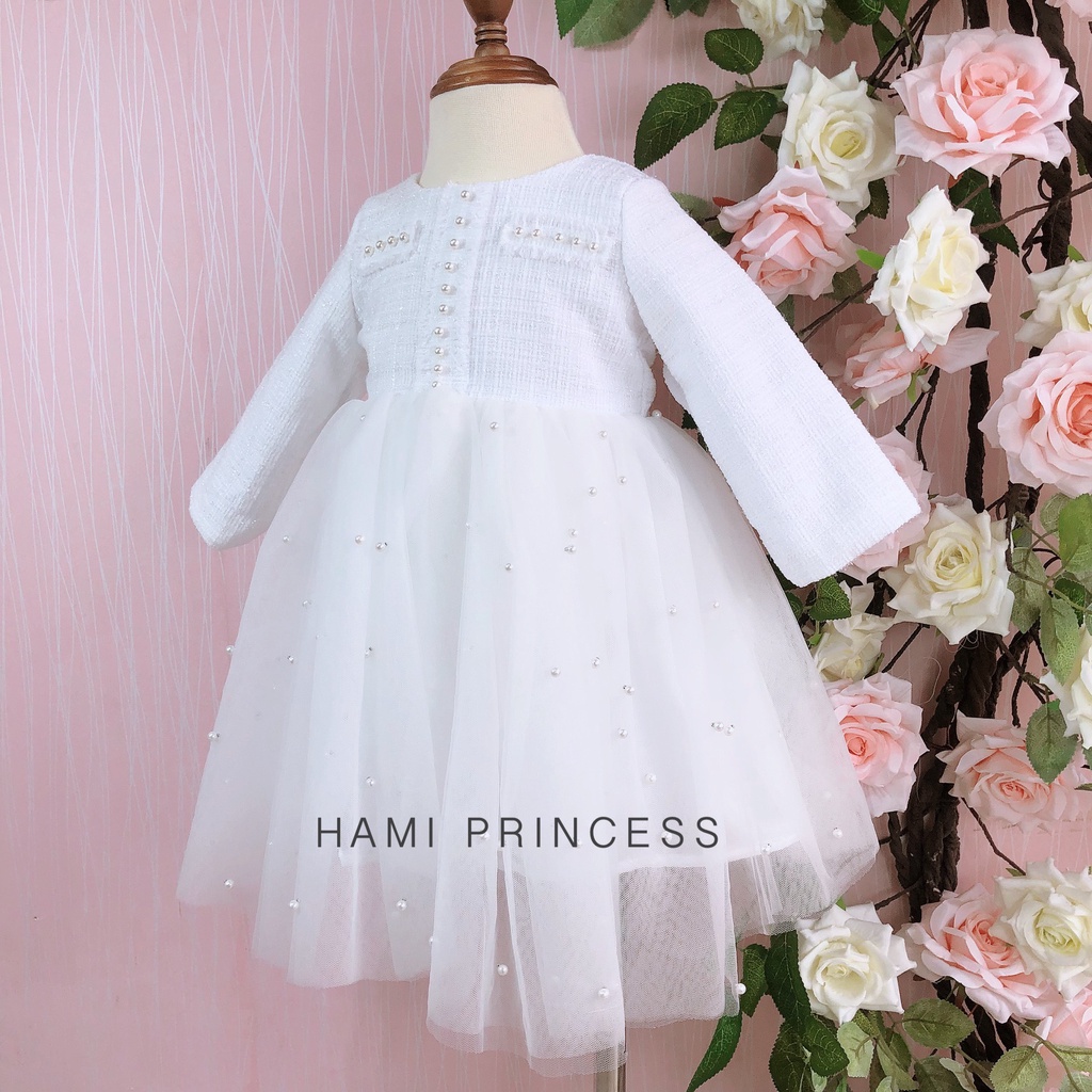 🎁 Là 1 trong 3 siêu phẩm váy dạ hot hit nhất mùa đông năm nay, váy dạ tweed trắng liền thân của Hami có thiết kế nổi bật với hàng ngọc trai phía trước kết hợp tùng xòe nhiều lớp phía dưới giúp chiều dáng, nịnh da mọi bé yêu