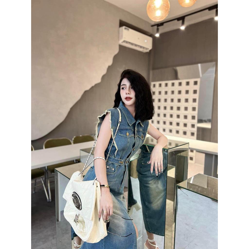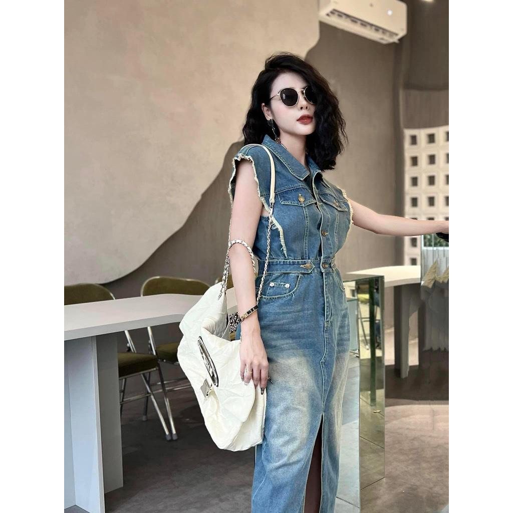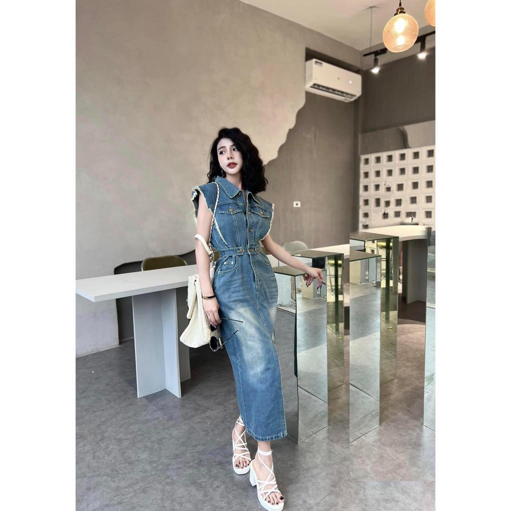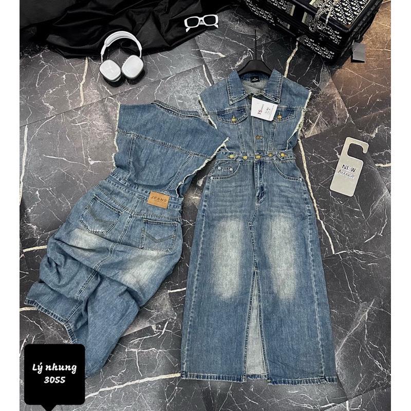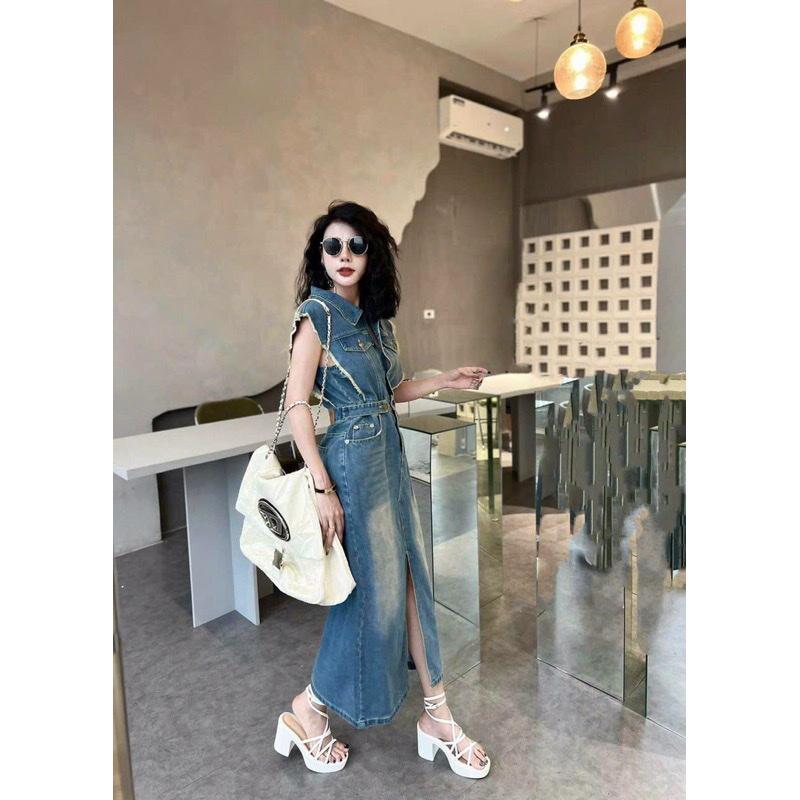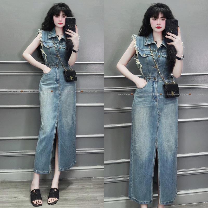 VÁY ĐI CHƠI, VÁY SUÔNG JEAN DÀI TAY NGẮN XẺ TRƯỚC CỰC HOT