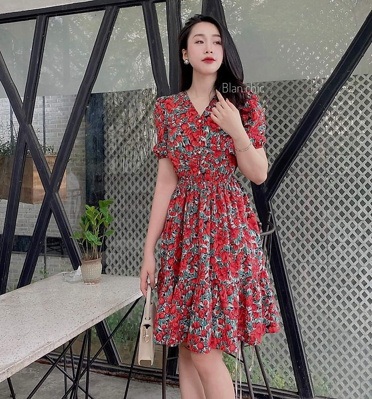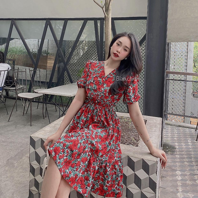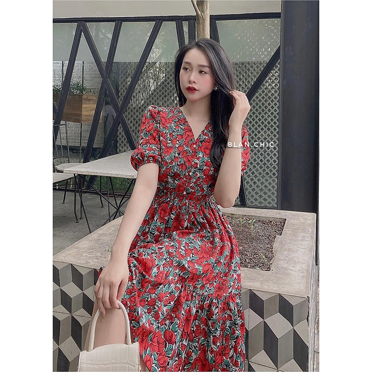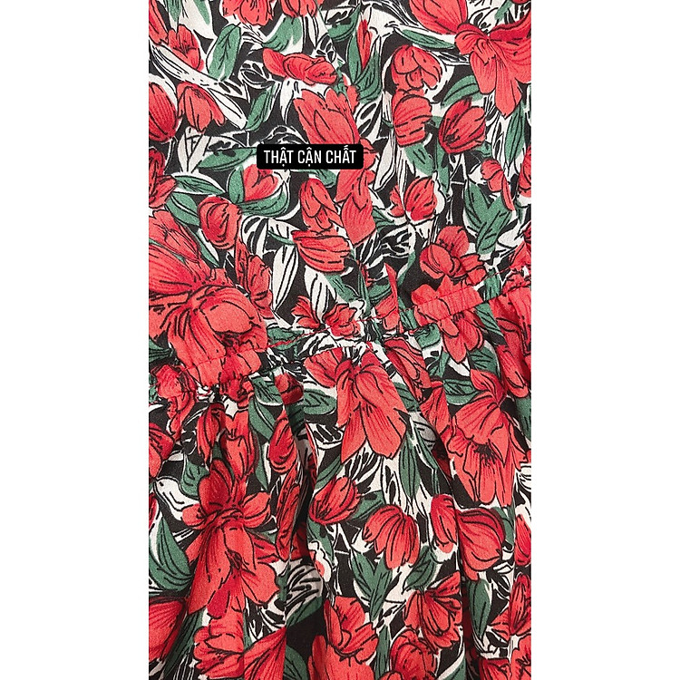 VÁY HOA ĐỎ VINTAGE CỔ V CHUN EO