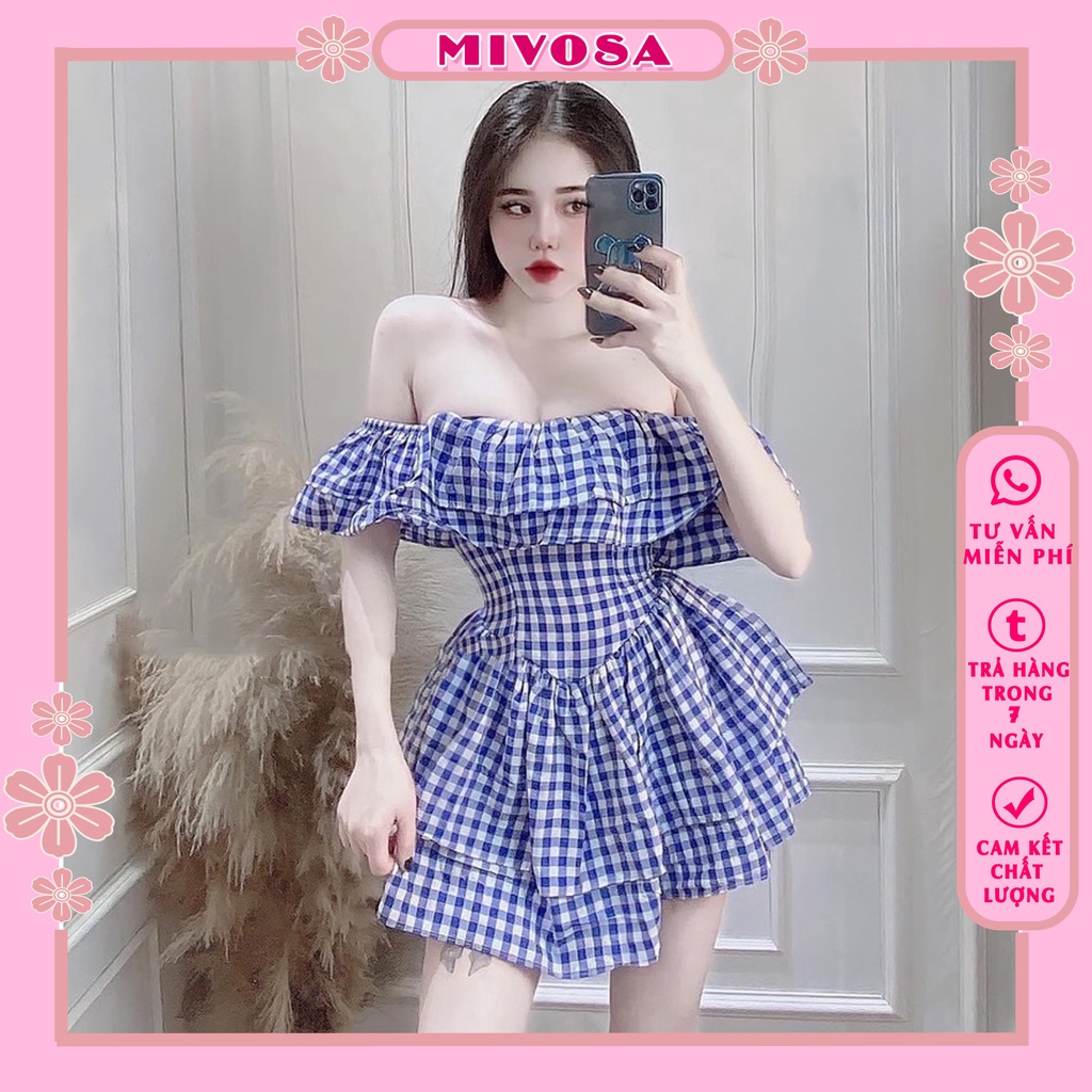 Thời Trang Nữ > Đồ liền thân > Đồ bay (Jumpsuits) || Váy kẻ xanh trễ vai dáng xòe tôn eo bánh bèo MIVOSA VN743