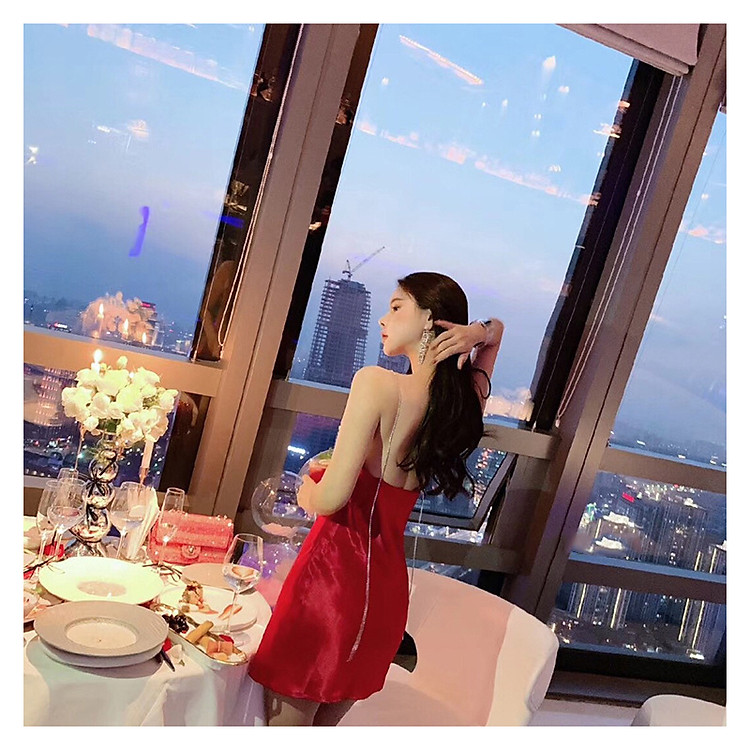 Mẫu đầm với thiết kế trơn với tone màu đỏ và đen, kết hộp dây kim cương khiến người phụ nữ vừa sang chảnh vừa cuốn hút.