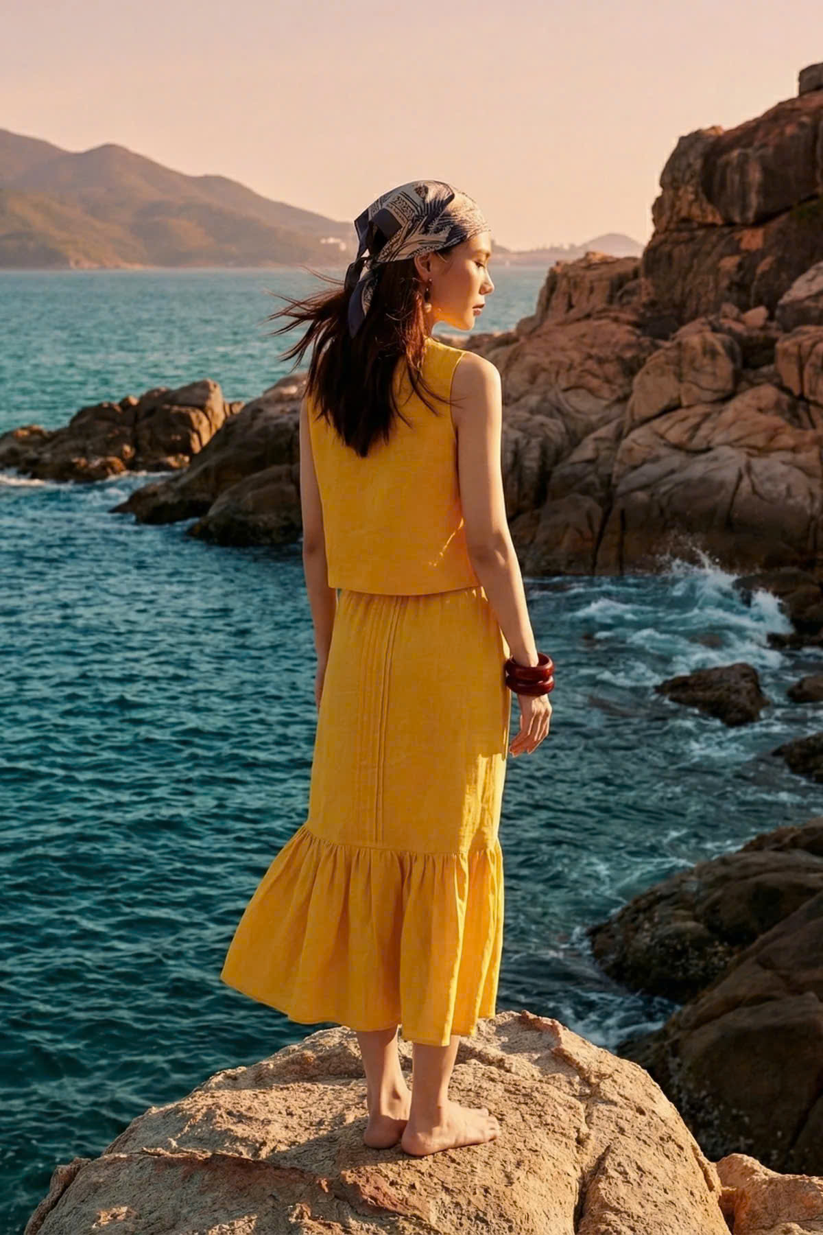 Ta không cần cố gắng để nổi bật, ta mang vẻ đẹp của sự tĩnh tại. Giữa sóng biển cuộn trào và những vách đá sần sùi, sắc vàng của bộ đồ là một lời khẳng định dịu dàng về sự nữ tính: mềm mại nhưng bền bỉ, rạng rỡ nhưng không chói lòa.