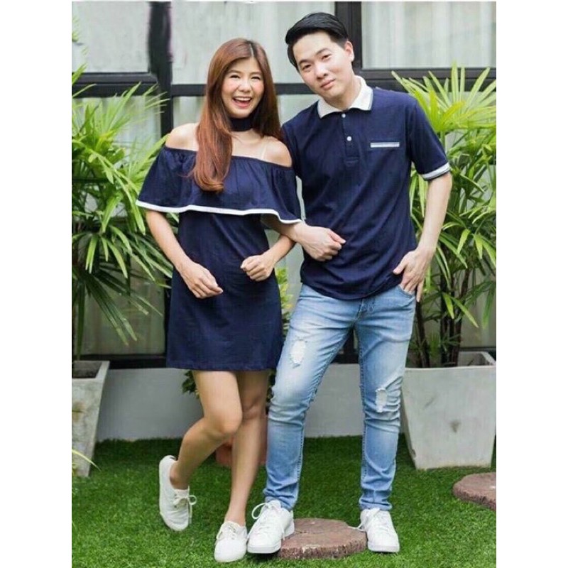 Set Váy thun trễ vai cute + Áo thun nam cổ bẻ