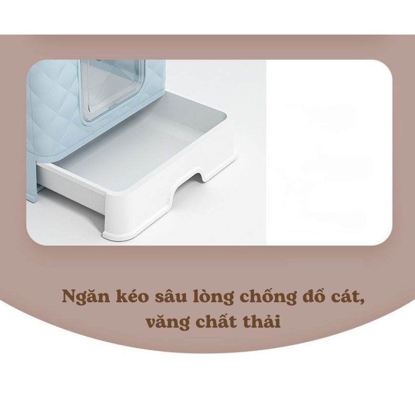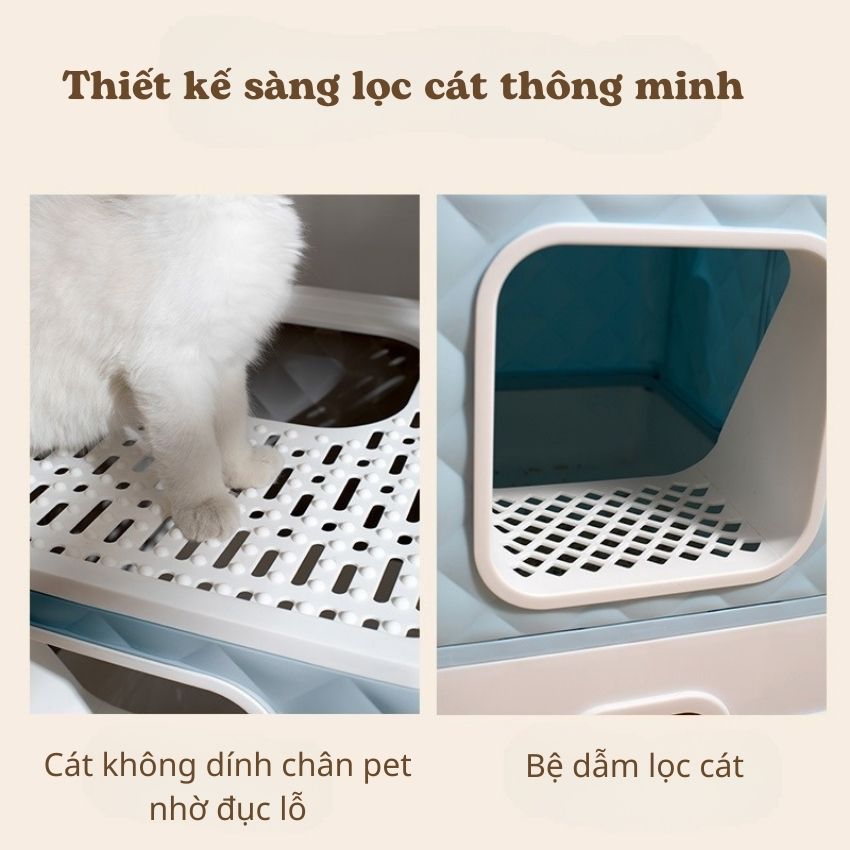 Thiết kế ngăn kéo cùng nắp trên chống văng cát khi mèo nhảy ra ngoài. Cửa vào bằng mica trong suốt, bạn có thể dễ dàng nhìn thấy bên trong.