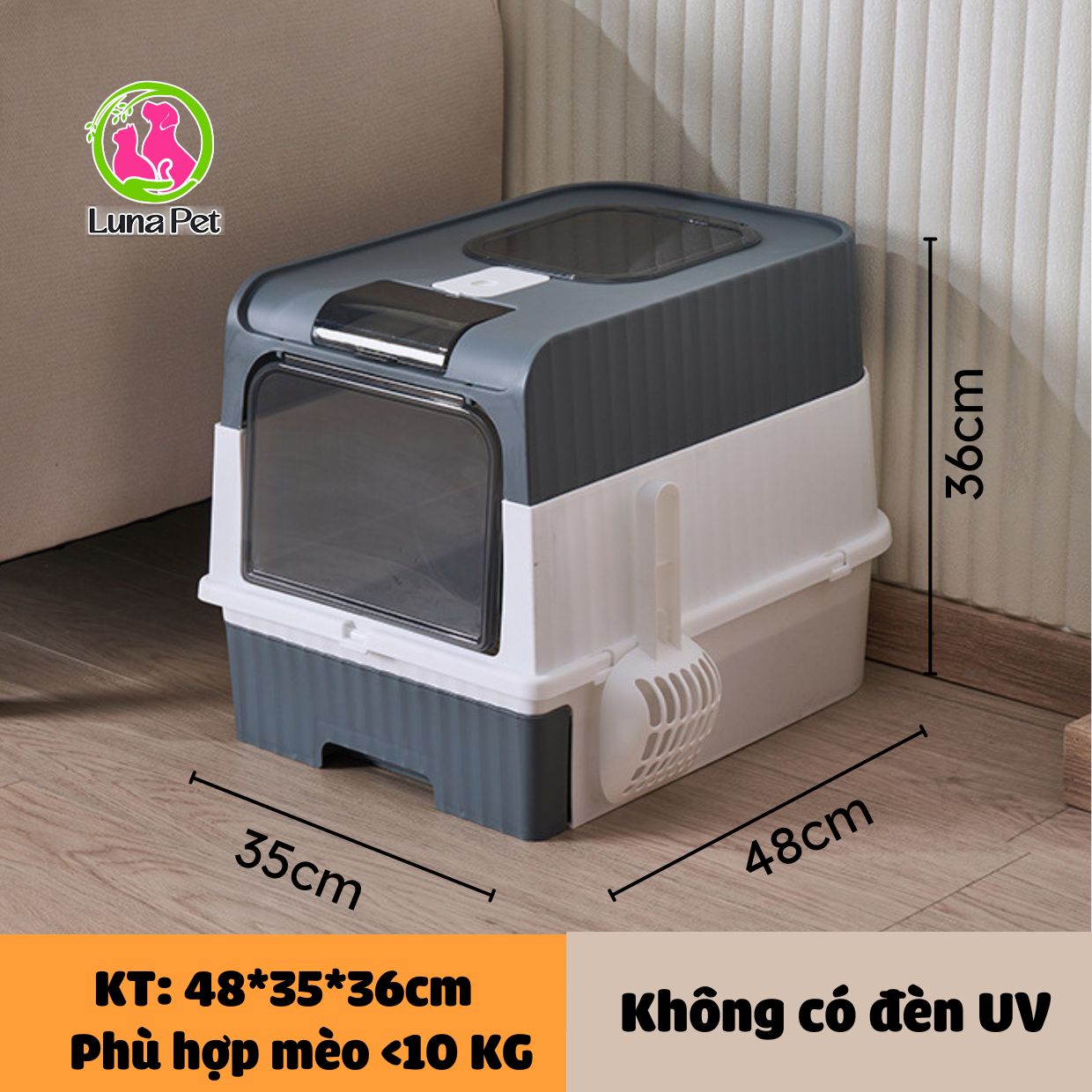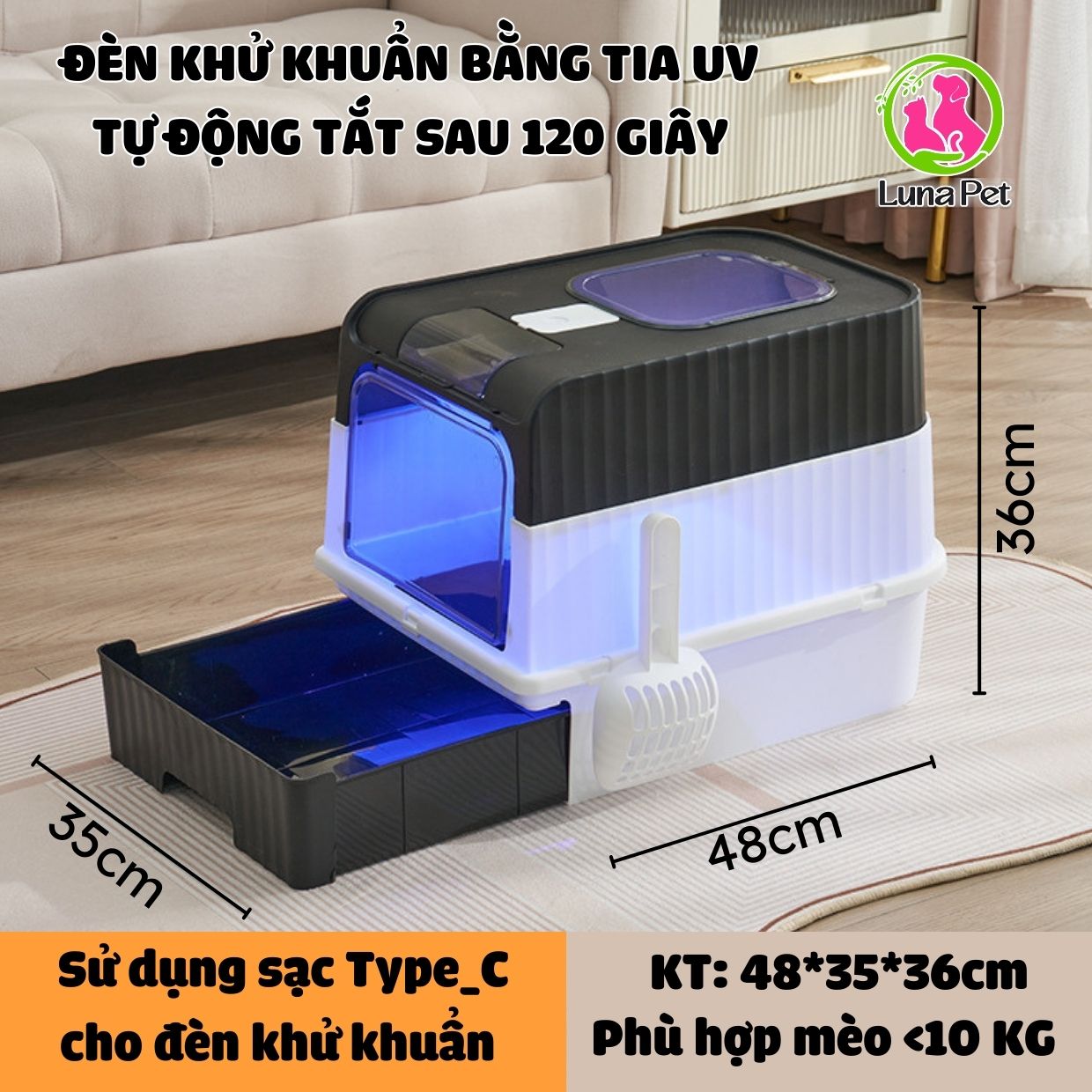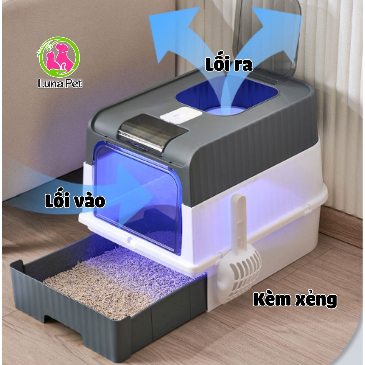 Nhà vệ sinh mèo cỡ lớn Luna Pet NV06, nhà vệ sinh cho mèo 2 cửa có đèn khử khuẩn UV