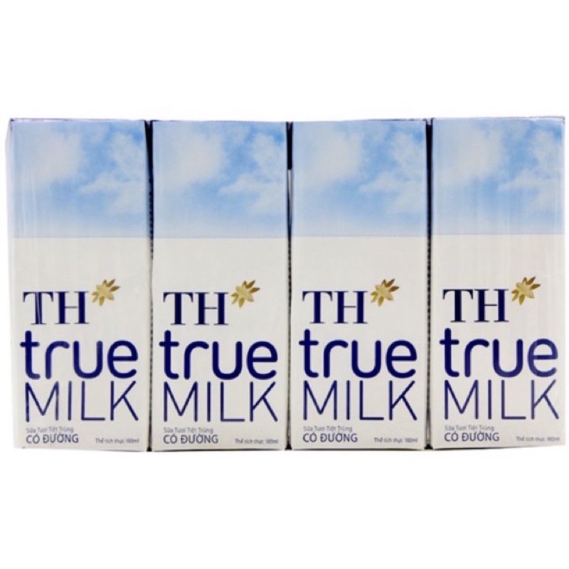 Sữa Tươi Tiệt Trùng TH True Milk Có Đường - Lốc 4 Hộp x 180ml-110ml Thông tin chung Thương hiệu TH True Milk Xuất xứ Việt Nam Thành phần Sữa hoàn toàn từ sữa bò tươi (96%), đường tinh luyện (3.8%), chất ổn định (e471, e418, e410) dùng cho thực phẩm Hướng dẫn sử dụng Dùng trực tiếp. Ngon hơn khi uống lạnh Bảo quản Bảo quản nơi khô ráo, thoáng mát. Sau khi mở hộp, bảo quản ở 4 - 10 độ C và sử dụng hết trong vòng 3 ngày