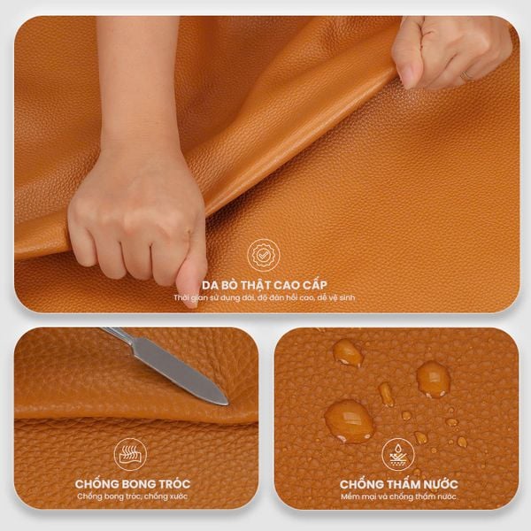 - Chất liệu da thật Việt Nam cao cấp, vân da mềm mại, không bong tróc và độ đàn hồi cao, bền đẹp, dễ dàng vệ sinh.