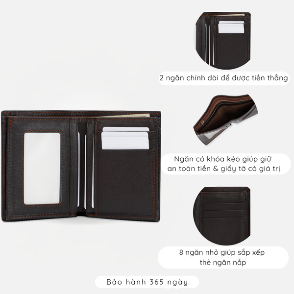 - Ví có nhiều ngăn chứa giúp sắp xếp gọn gàng giấy tờ, thẻ, tiền, dễ dàng và nhanh chóng tìm thấy khi cần.