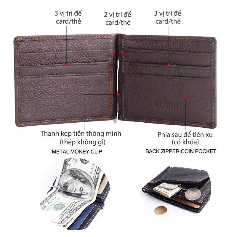 Ví có 6 vị trí để thẻ/card, 02 vị trí để thẻ/card ẩn, 01 khe để tiền xu hay tiền lẻ, 01 kẹp tiền thông minh bằng kim loại.