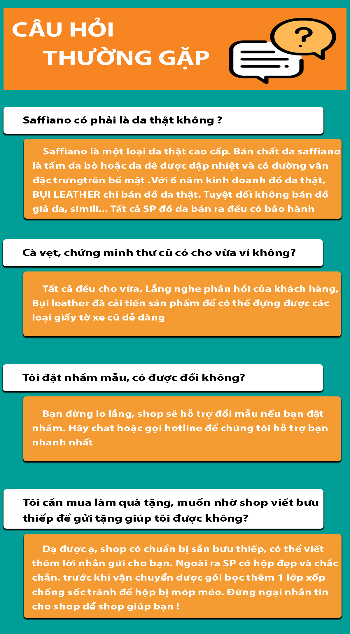 | Kích thước | Chi tiết sản phẩm ví da nam cao cấp da saffiano V126Chất liệu: da Safiano Saffiano là dòng da được hãng da hàng đầu của Ý – Prada nghiên cứu và phát triển từ năm 1913. Người sành đồ da đều biết da SAFFIANO là dòng da rất cao cấp khá đắt đỏ; Điểm khác biệt của da Saffiano là sau khi tấm da động vật được thuộc (thường là da bê), tấm da thuộc đó sẽ được dập ở nhiệt độ phù hợp tạo ra các họa tiết vân chéo lên da (Vân da rất đặc trưng). Và để tăng độ bền cho các họa tiết vân chéo này, người ta sẽ tráng lên bề mặt phủ thêm 1 lớp plastic hoặc sáp lên để bảo quản bề mặt: da sẽ không bị trầy sước, không bị thấm nước.Màu sắc: Đen; Xanh navy; Nâu bò; Nâu cafePhân loại: Ví ngangKích thước: ví ngang 12,5 x 9,5 cmNgăn chính: Bên trong có 3 ngăn chính (1 ngăn có khóa kéo). Các ngăn được phân chia bằng lót da heo, không sử dụng lót vải (lót vải kém sang, sử dụng nhanh bị sờn)Ngăn phụ: 2 bên có tới 6 ngăn phụ đựng thẻ (step thẻ).2 ngăn to đựng được cả giấy tờ CŨ, cà vẹt xe CŨƯu đãi khi mua hàng từ Bụi leather:Freeship+: MIỄN PHÍ giao hàng toàn quốc: đơn hàng từ 149K hỗ trợ tối đa 30K, đơn hàng từ 299k hỗ trợ tối đa 50K...Giảm 10K đơn hàng 299K; 30K đơn 599K… mua càng nhiều giảm càng sâu . Ngoài ra còn nhiều mã giảm giá khác ở các đợt Sale khác nhau (nhớ sưu tầm mã giảm giá trước khi đặt hàng) |