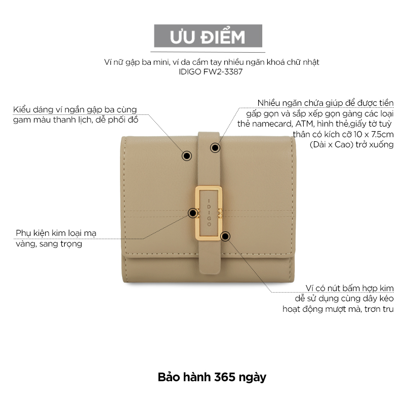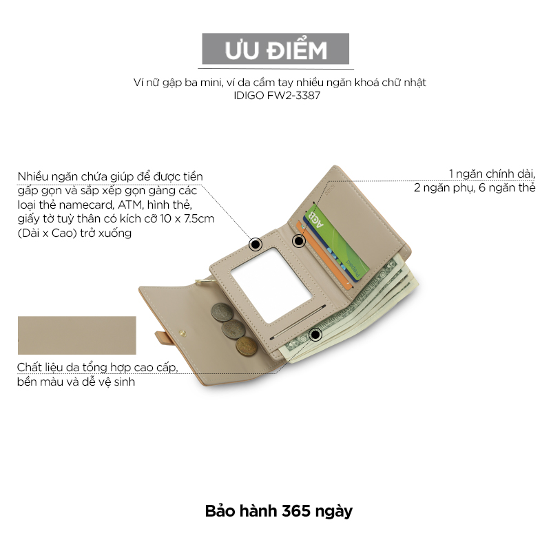 Một chiếc ví nhỏ nhắn với đa dạng kiểu dáng và màu sắc lại rất hữu dụng ắt hẳn sẽ khiến cho các cô nàng yêu thời trang phải siêu lòng ngay từ ánh nhìn đầu tiên. Thấu hiểu được tâm tư của các nàng, IDIGO cho ra mắt sản phẩm Ví nữ gập ba mini, ví da cầm tay nhiều ngăn khoá chữ nhật IDIGO FW2-3387