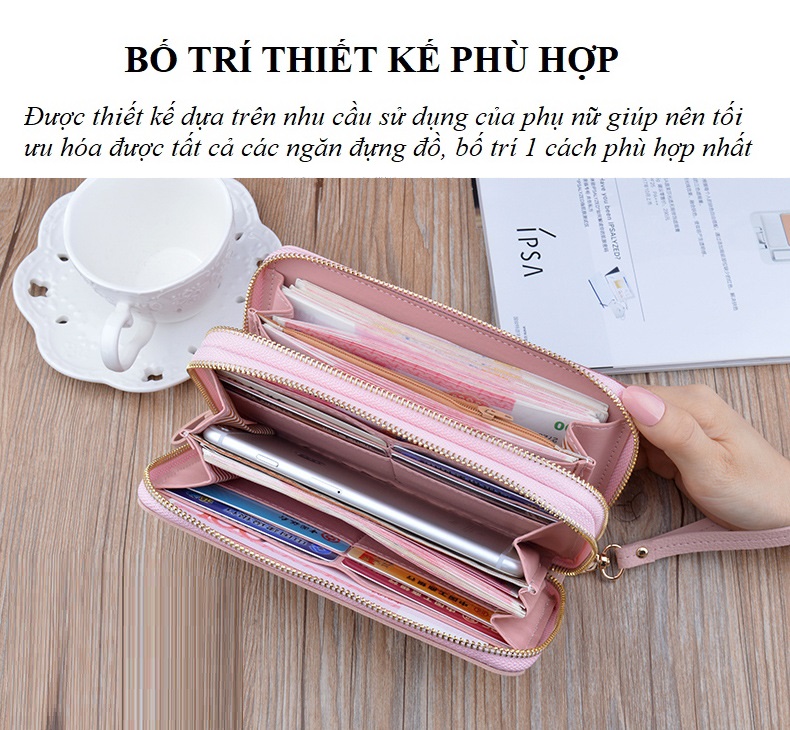 Ví nữ dài có tới 5 ngăn lớn, trong đó có một ngăn khóa kéo cực tiện lợi. Các ngăn khá rộng rãi, thoải mái cho chủ nhân có thể đựng điện thoại, giấy tờ, tiền, hóa đơn, vé xe… Ngoài ra dung tích của ngăn lớn có thể đựng vừa điện thoại vô cùng tiện lợi