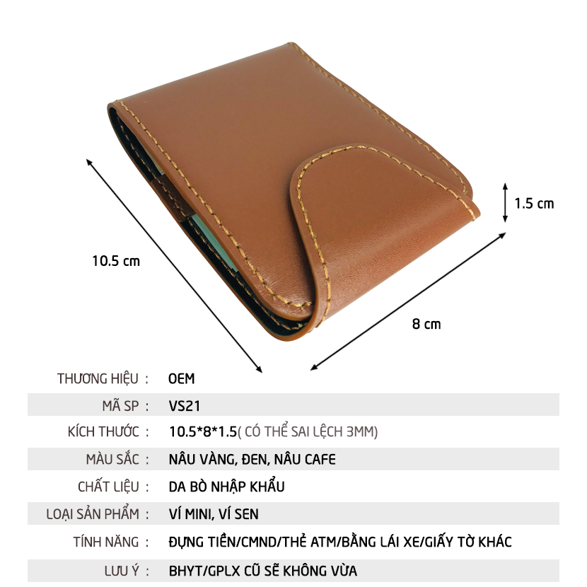 - VÍ MINI VS24 của Heki Shop được thiết kế rất đẹp và thời trang. Được làm từ da bò 100% đem lại cảm giác sang trọng, bề mặt chống thấm nước, không gãy đứt, bong tróc da.