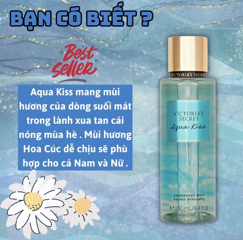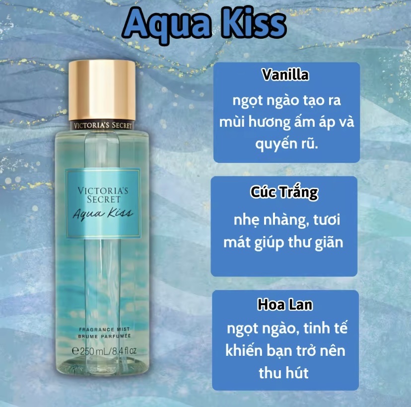 -Body Mist , Lotion Victoria's Secret Aqua Kiss thuộc nhóm hương hoa cỏ, kết hợp giữa hương hoa lan Nam Phi sang trọng và mùi hoa cúc dại. Với sự kết hợp này, Aqua Kiss mang lại hương thơm thanh mát và dịu nhẹ, tạo cảm giác thư giãn và phù hợp cho mùa hè. Một chút hương vani thoang thoảng giúp tăng thêm sự hấp dẫn cho mùi hương Aqua Kiss.
