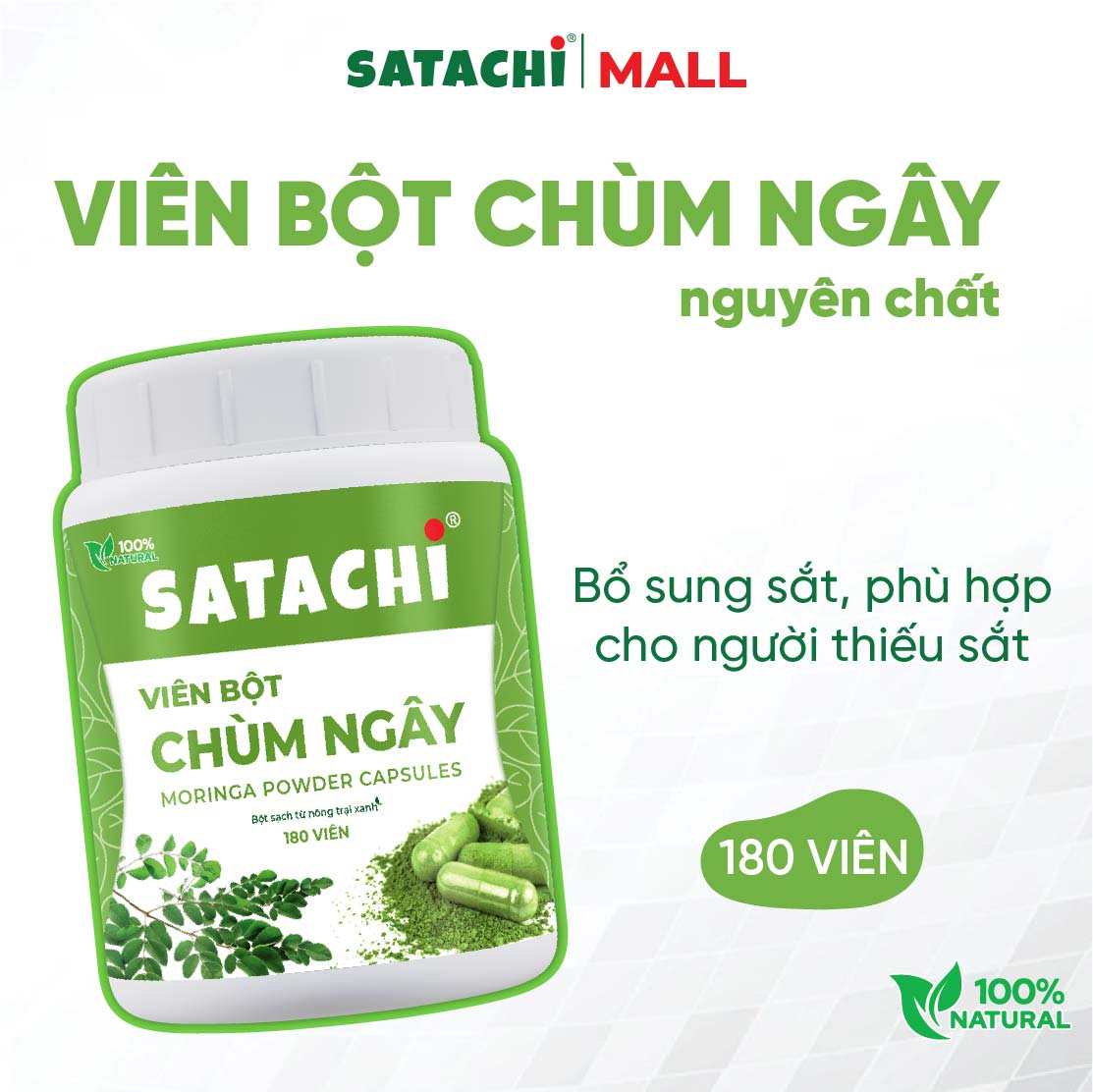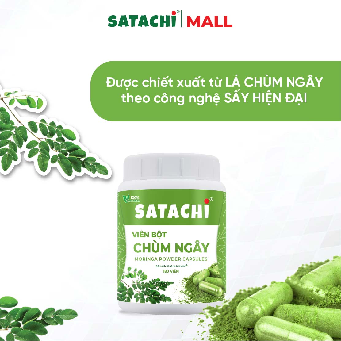 Viên Bột Chùm Ngây Nguyên Chất SATACHI – 100% Lá Chùm Ngây – Dạng Viên Tiện Lợi – Hộp 180 viên