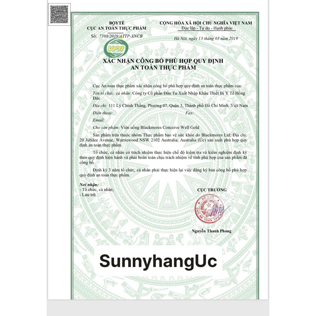 Sản phẩm này không phải là thuốc, không có tác dụng thay thế thuốc chữa bệnh Date 2022 Viên uống tăng khả năng thụ thai Blackmores Conceive Well Gold của Úc --------------------------------------------------- 🌸🌸🌸Viên uống tăng khả năng thụ thai Blackmores Conceive Well Gold của Úc 👌Hãng sản xuất: Blackmores 👌Xuất xứ: Úc 👌Quy cách đóng gói: Hộp 56 viên (28 viên nang mềm và 28 viên nén) 🌸Blackmores Conceive Well Gold là vitamin dành riêng cho phụ nữ có kế hoạch thụ thai giúp bổ sung vitamin và các dưỡng chất thiết yếu cho phụ nữ trước giai đoạn mang thai, hỗ trợ tăng khả năng thụ thai cho phụ nữ. Đồng thời conceive well gold giúp họ có một sự chuẩn bị kĩ càng hơn cho quá trình thụ thai đầy đủ dưỡng chất và khỏe mạnh, hỗ trợ sự phát triển lành mạnh của thai nhi giai đoạn mang thai. 🌸Công dụng 👌Cung cấp các chất dinh dưỡng cần thiết hỗ trợ rụng trứng bình thường và giúp thụ thai dễ dàng hơn. 👌Cung cấp các chất dinh dưỡng cần thiết cho giai đoạn hình thành và phát triển của thai nhi. 👌Cung cấp các chất dinh dưỡng chống oxy hóa mạnh giúp thụ thai diễn ra bình thường. 👌Cung cấp đủ hàm lượng chất CoQ10 (CoQ10 là một chất chống oxy hóa tự nhiên kết hợp cho một thai kỳ khỏe mạnh ở giai đoạn đầu). 👌Cung cấp I-ốt (Iodine) rất quan trọng cho sự phát triển não bộ và thị lực của thai nhi. Tối ưu hóa mức độ cung cấp I-ốt cho cơ thể trước khi mang thai (bình thường phải mất đến 5 tháng bổ sung để cơ thể có đầy đủ I-ốt). 👌Cung cấp 500 mcg Acid Folic mỗi ngày, giúp làm giảm nguy cơ dị tật ống thần kinh nếu dùng trước thời kỳ mang thai 1 tháng và trong cả khi mang thai. Có chứa dầu cá ngừ, một nguồn acid béo omega-3 DHA giúp tăng cường thị lực. 🌸Hướng dẫn sử dụng Mỗi ngày uống 1 viên nang mềm và1 viên nén trong hoặc ngay sau bữa ăn Sử dụng đúng liều lượng quy định