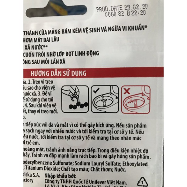Lấy vỉ treo ra khỏi hộp chứa, treo vỉ phía bên trong thành bồn cầu sao cho viên vệ sinh tiếp xúc với dòng chảy của nước xả. Để vỉ tại vị trí treo ban đầu để sử dụng cho tới khi viên vệ sinh hòa tan hết. Sau khi viêm vệ sinh hòa tan hết thì thay vỉ mới. Lưu ý: Nhớ rửa tay sau khi treo. Chú ý: