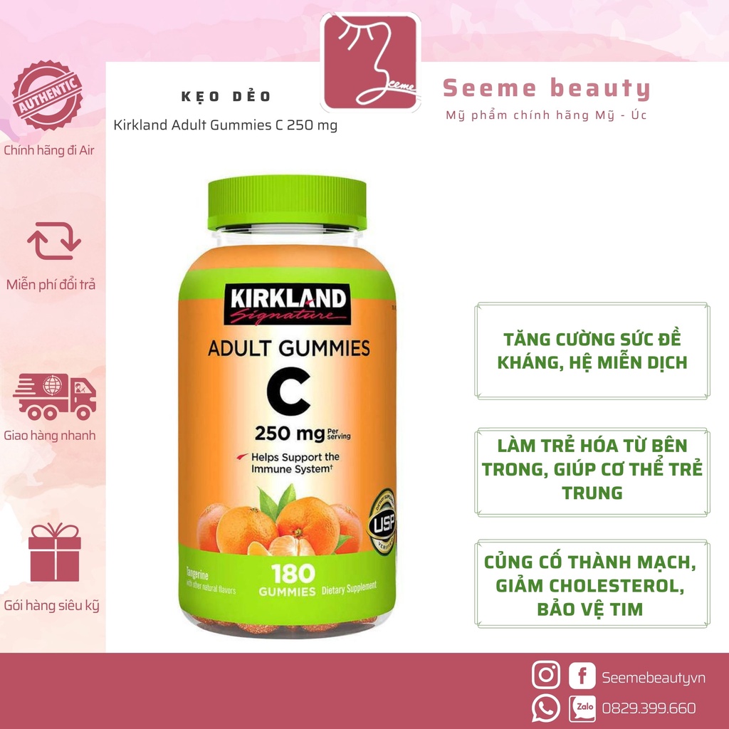 🍊 CÔNG DỤNG ✅ Kẹo dẻo vitamin C Kirkland tăng sức đề kháng, bổ sung vitamin C cung cấp 250mg vitamin C cần thiết mỗi ngày ✅ Kẹo dẻo vitamin C Kirkland tăng sức đề kháng, bổ sung vitamin C trung hòa gốc tự do trong cơ thể, tăng cường miễn dịch và sức đề kháng cho cơ thể, hỗ trợ sức khỏe, phòng ngừa các bệnh như: cảm cúm, nóng sốt... ✅ Vitamin C thúc đẩy tổng hợp #collagen, hỗ trợ sự linh hoạt của xương khớp và duy trì vẻ đẹp trẻ trung ✅ Bổ sung kẹo dẻo vitamin C Kirkland đầy đủ mỗi ngày giúp củng cố thành mạch, giảm cholesterol, bảo vệ tim, thải độc tố ra khỏi cơ thể. ✅ Phòng ngừa thiếu máu vì vitamin C tăng hấp thu sắt.