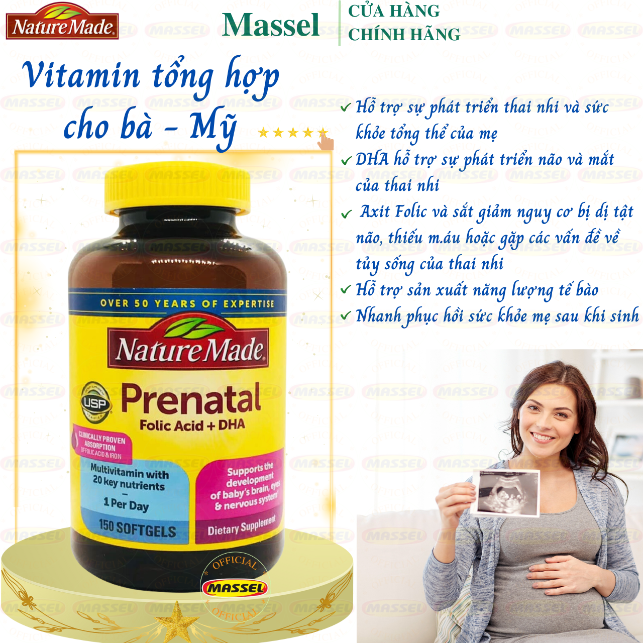 | Hướng dẫn sử dụng | Hướng dẫn sử dụng:- Liệu trình sử dụng: Ngày uống 1 viên bầu Prenatal DHA sau ăn.- Trong thành phần vitamin tổng hợp Nature Made Prenatal có chứa 800mcg Acid Folic (100%) nên không cần bổ sung thêm Acid Folic nếu không có chỉ định của chuyên gia.- Ngoài ra khi mang thai từ 3 tháng trở đi nên bổ sung thêm Canxi giúp phát triển hệ xương răng cho bé, trống còi xương và suy dinh dưỡng. |