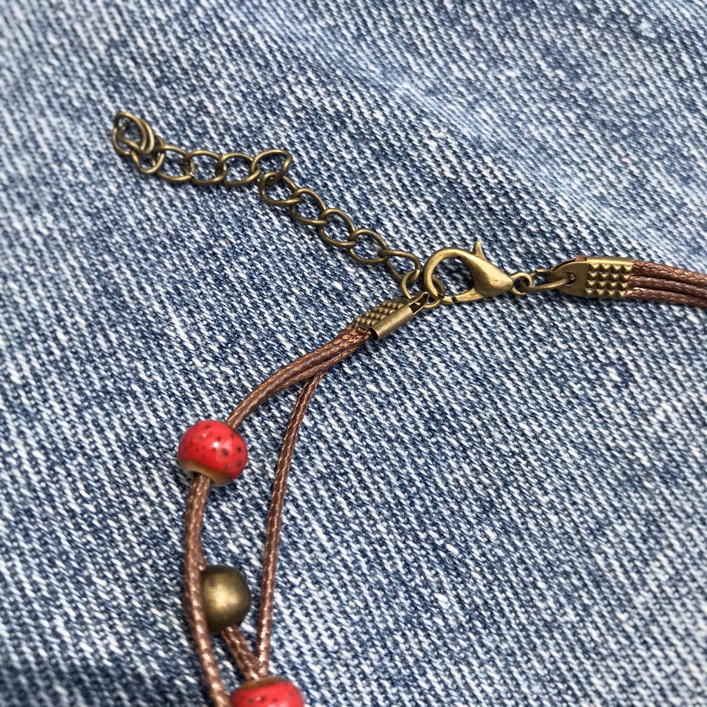 - Vòng chân (lắc chân) gốm được làm hoàn toàn thủ công, các hạt gốm đỏ bóng đẹp được sắp xếp hài hòa đan xen với các hạt kim loại, ngôi sao, hoa và chuông nhỏ. Dây da, móc và dây kim loại vô cùng chắc chắn, các nàng yên tâm sử dụng trên mọi mặt trận. - Kích thước: điều chỉnh theo vòng chân từ 20-25 cm.
