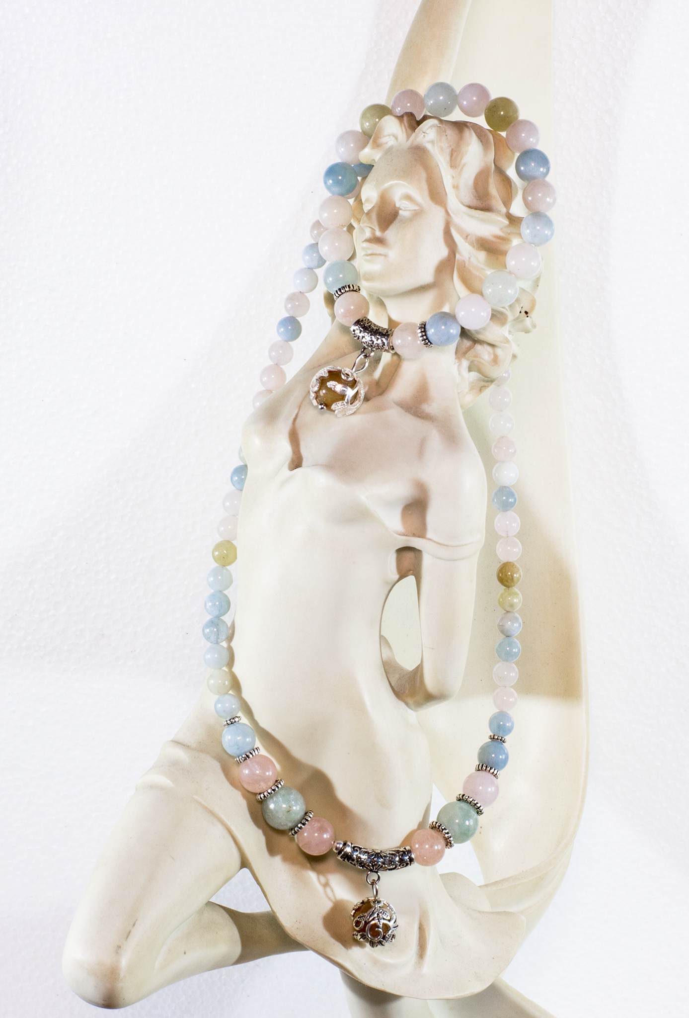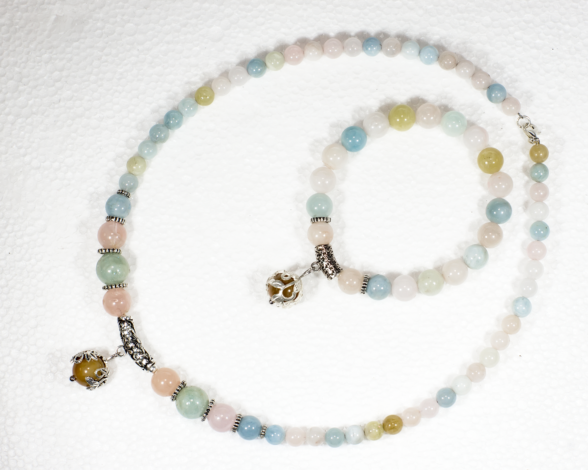 Một chiếc vòng cổ với 56 viên đá Beryl đa sắc thiên nhiên từ 6-9mm mang màu pastel nhẹ nhàng, thêm 1 viên cẩm thạch (Jadeite) lem huyết tự nhiên được bọc bạc 92.5 tinh xảo, mix với bộ charm bạc 92.5%, tone-sur-tone với vòng tay, đầy quyến cũ và cực kiêu sa.